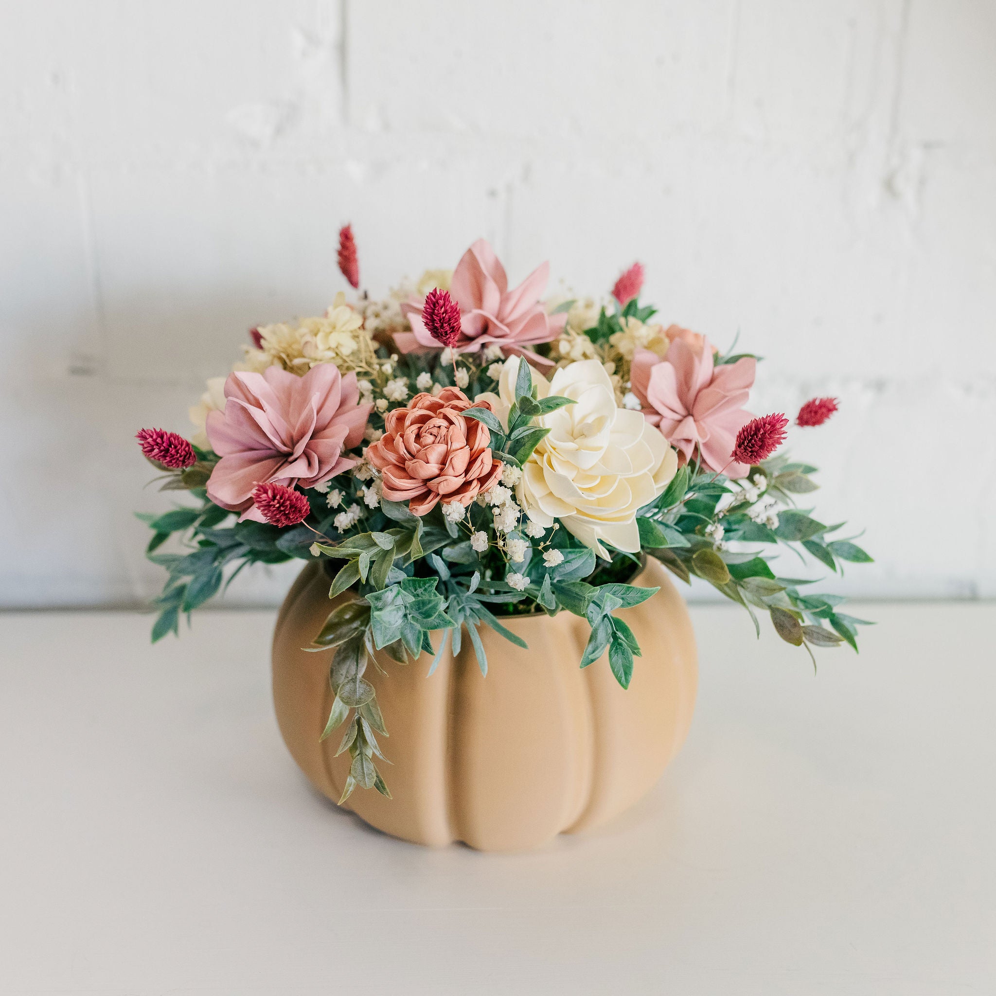 Welcome the warm and cozy feeling of fall with our pumpkin arrangement! Adorned with rich colors, this beautiful floral arrangement is the perfect addition to your autumn decor. Bring the beauty of the season into your home with this lovely piece. Our Caramel Apple Pumpkin Arrangement features sola wood and dried flowers in beige, nutmeg, dusty rose, soft green and berry in an exclusive wood-brown pumpkin pot.