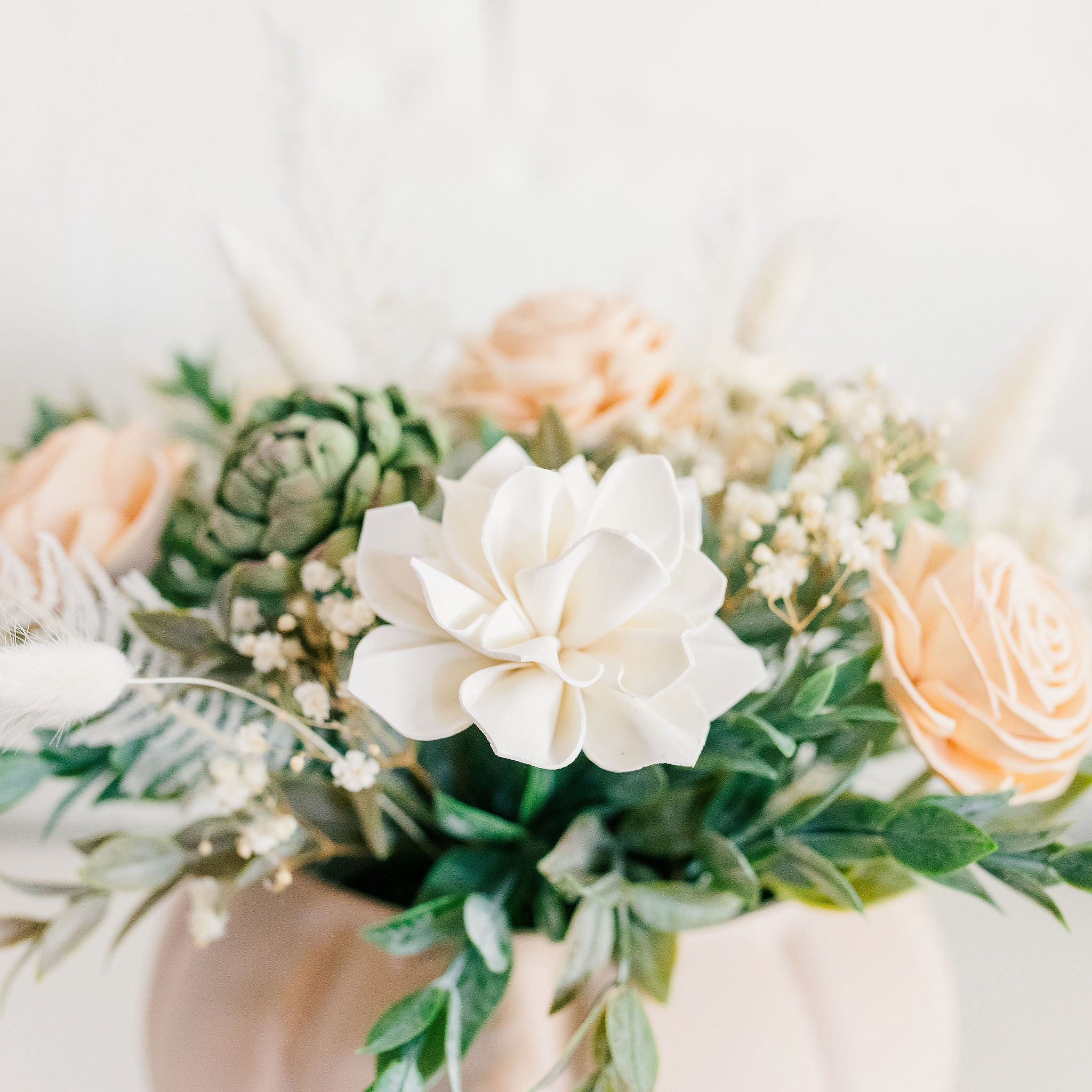 We use any combination of sola wood, preserved, dried, and real-touch (faux) flowers and foliage. This combination truly lets us unleash creativity both in color and design. Never throw away flowers again! Your flowers can last a lifetime with proper care. For care and FAQ click here: CARE & FAQ