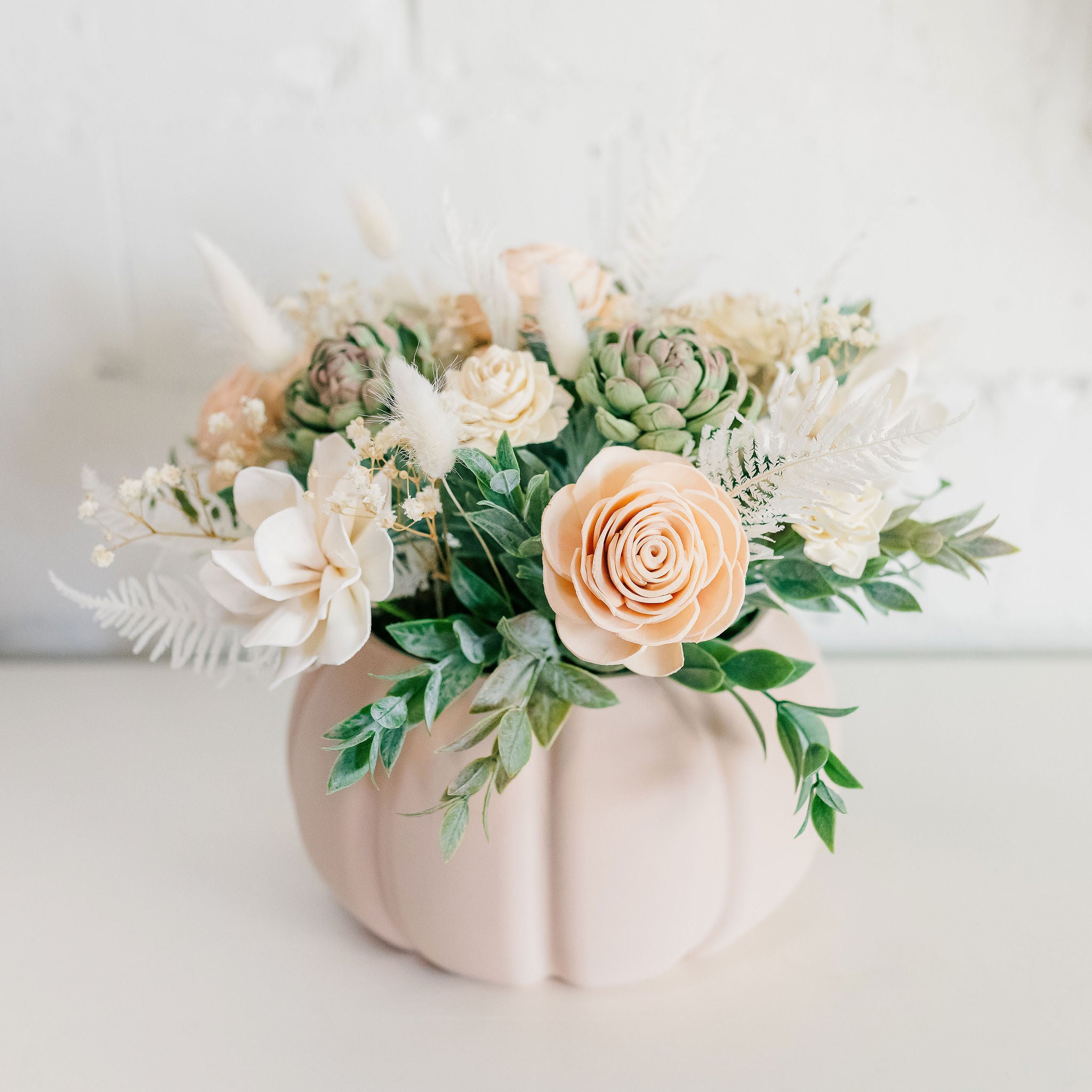 Welcome the warm and cozy feeling of fall with our pumpkin arrangement! Adorned with rich colors, this beautiful floral arrangement is the perfect addition to your autumn decor. Bring the beauty of the season into your home with this lovely piece. Our Vanilla Chai Arrangement features sola wood and dried flowers in beige, ivory, white and sage green in an exclusive beige pumpkin pot.