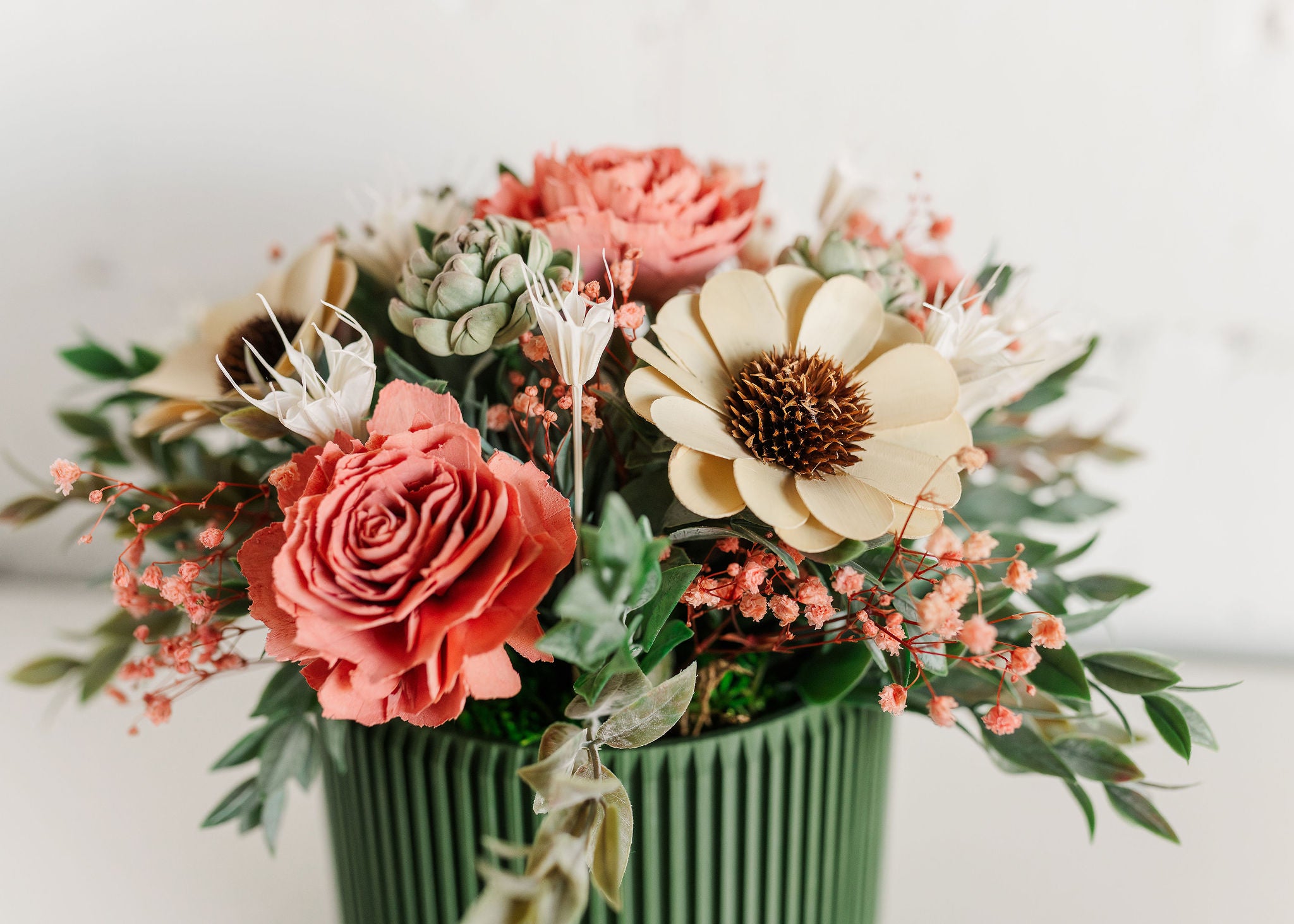 Antique Fields arrangement. This arrangement has beautiful sola wood flowers of natural wood, antique coral and sage green with complimentary foliage and fillers. Comes in an army green ribbed pot.