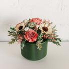 We use any combination of sola wood, preserved, dried, and real-touch (faux) flowers and foliage. This combination truly lets us unleash creativity both in color and design. Never throw away flowers again! Your flowers can last a lifetime with proper care. For care and FAQ click here: CARE & FAQ
