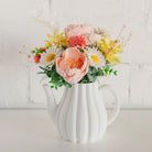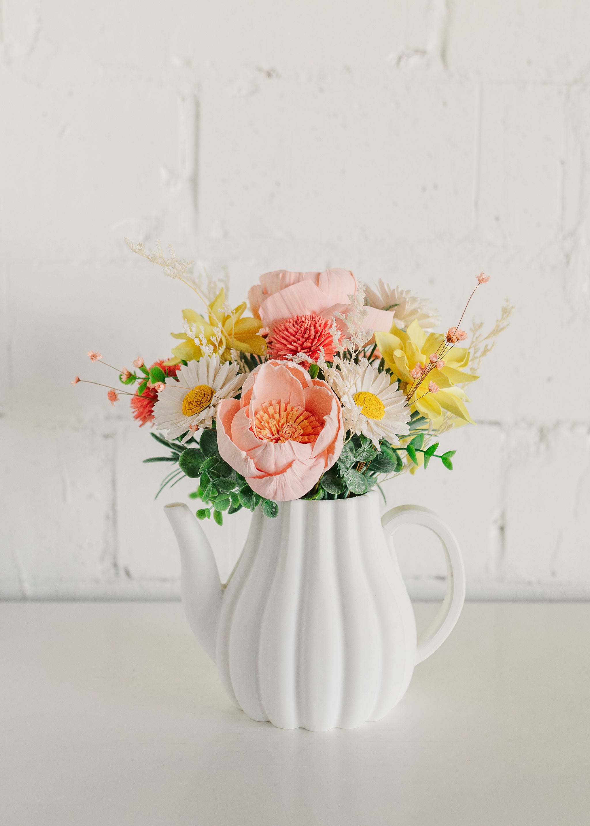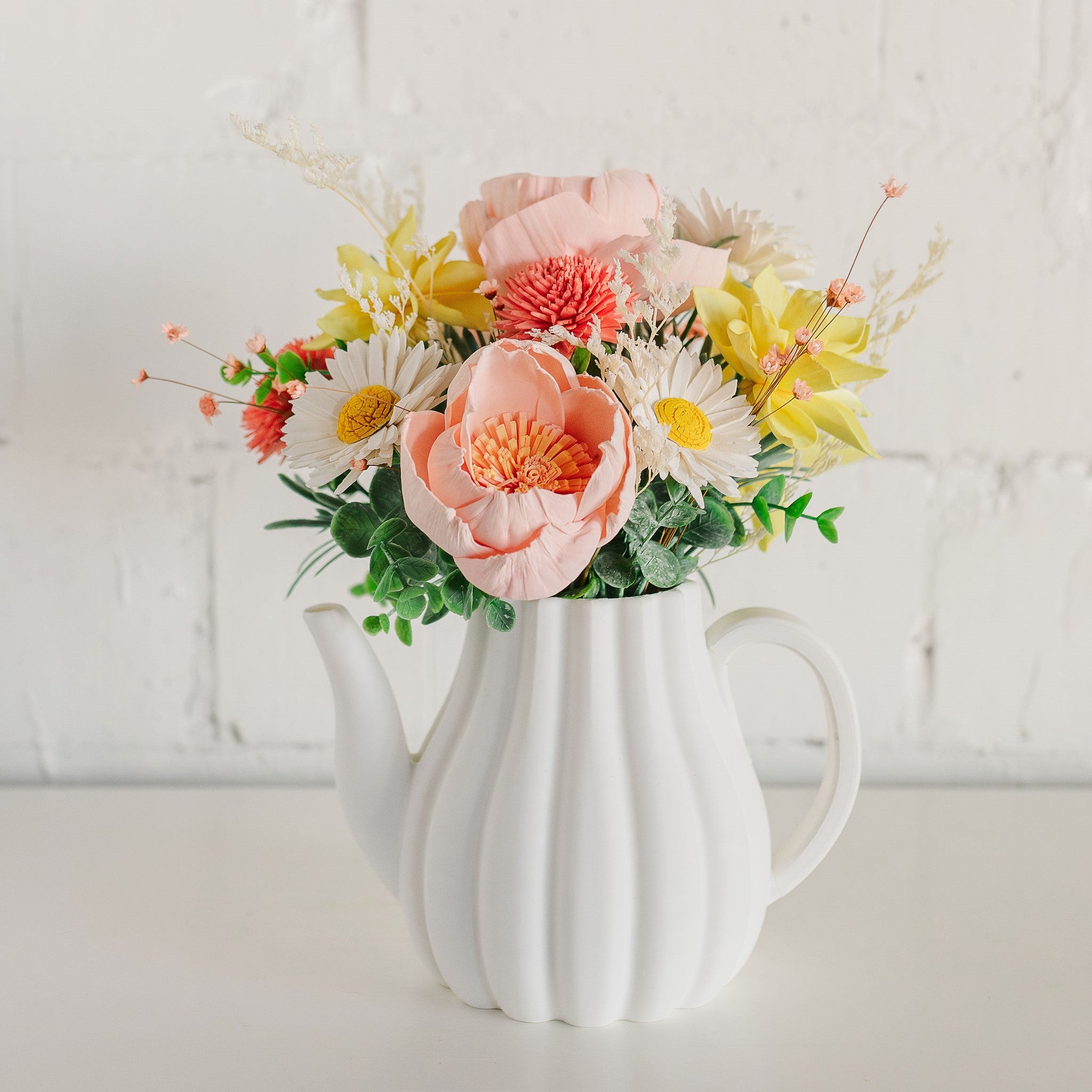 Blooming Tea arrangement. This arrangement has beautiful sola wood flowers of white, blush, soft yellow and coral with complimentary foliage and fillers. Comes in a white teapot.