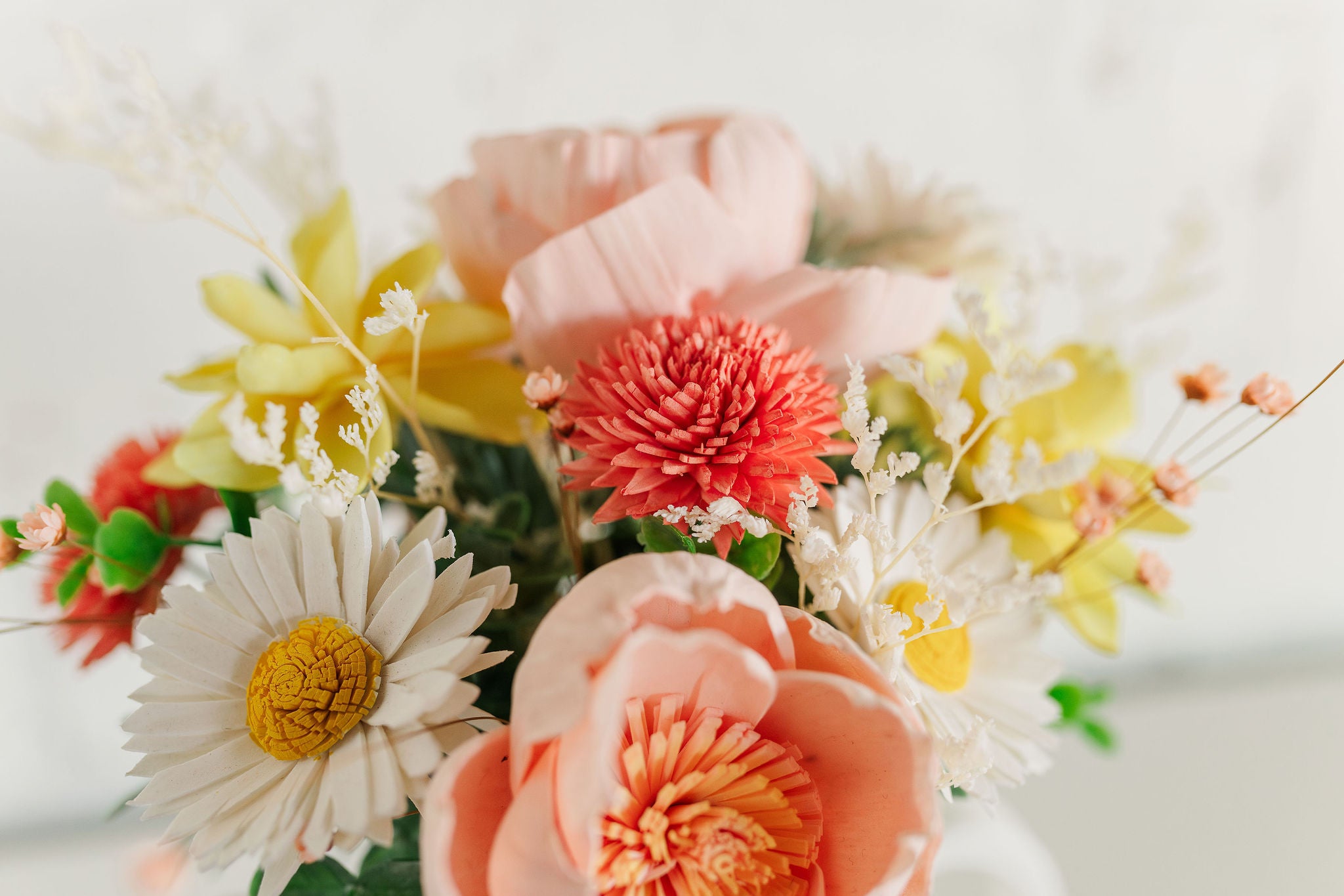 Our flowers are made from sola wood. It is incredibly lightweight and soft to the touch. Every flower is handmade and hand-painted, allowing us to create truly one-of-a-kind flowers. Unlike silk flowers these retain a natural look and feel since they are made from organic material, each flower is truly unique.