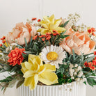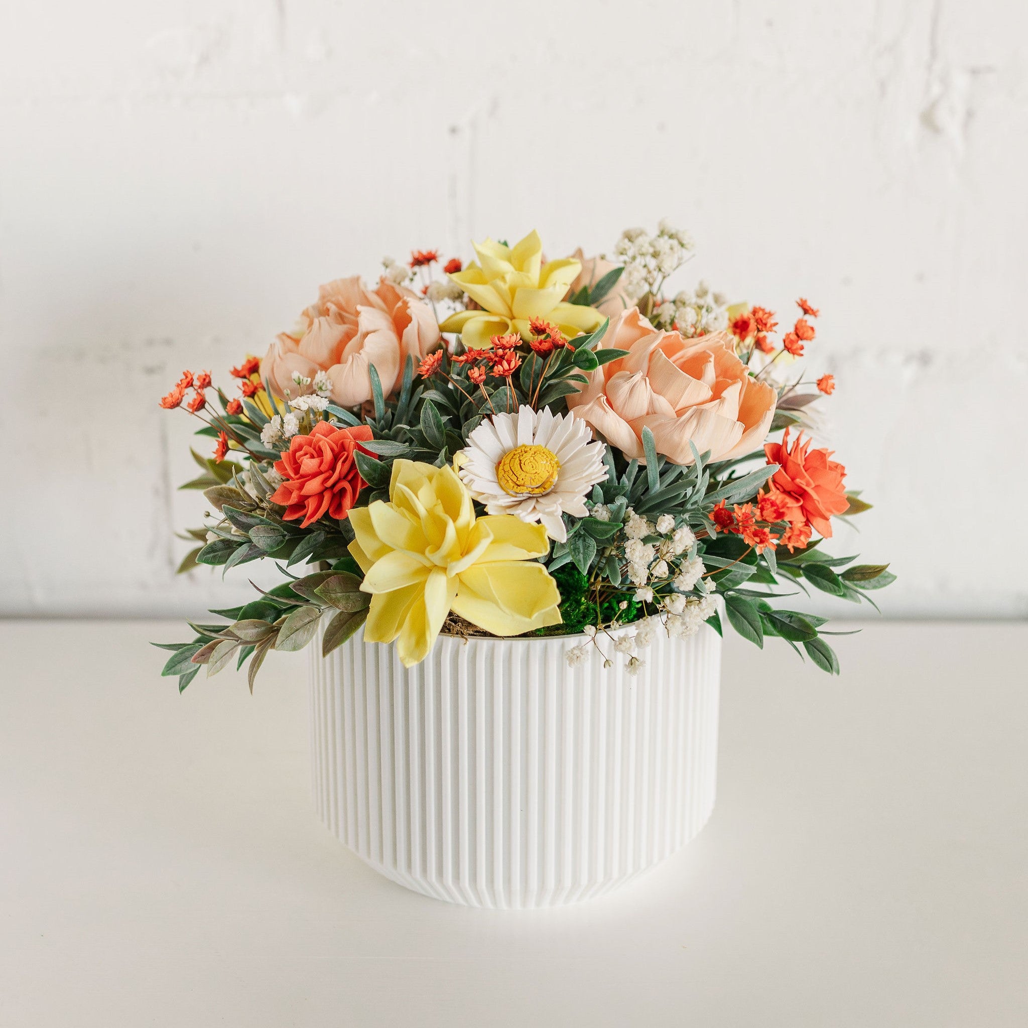 Citrus Bliss arrangement. This arrangement has beautiful sola wood flowers of tangerine, white, yellow and salmon with complimentary foliage and fillers. Comes in a ribbed pot.
