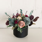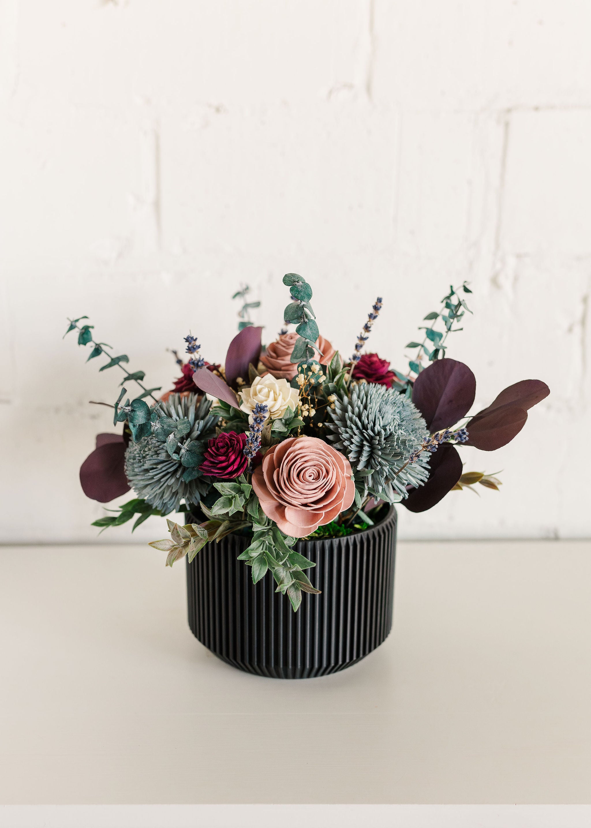 Classic Romantic arrangement. This arrangement has beautiful sola wood flowers of dusty rose, dusty blue, burgundy, ivory and plum with complimentary foliage and filler. Comes in a black ribbed pot.