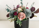 We use any combination of sola wood, preserved, dried, and real-touch (faux) flowers and foliage. This combination truly lets us unleash creativity both in color and design. Never throw away flowers again! Your flowers can last a lifetime with proper care. For care and FAQ click here: CARE & FAQ