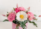 The arrangement pictured reflects our original design for this product. While we always follow the color palette, we may replace flowers and foliage depending on availability. Due to lighting when photos were taken and differences in screen appearances, products might appear lighter/darker or differ in color than actual physical products. Every arrangement is custom-made, and the placement of flowers may vary from the photos.