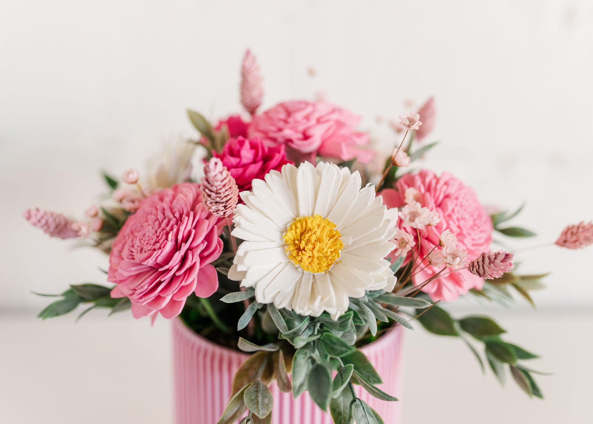 Sweet & Fun arrangement. This arrangement has beautiful sola wood flowers of pink, fuchsia, and white with complimentary foliage and filler. Comes in a pink ribbed pot.