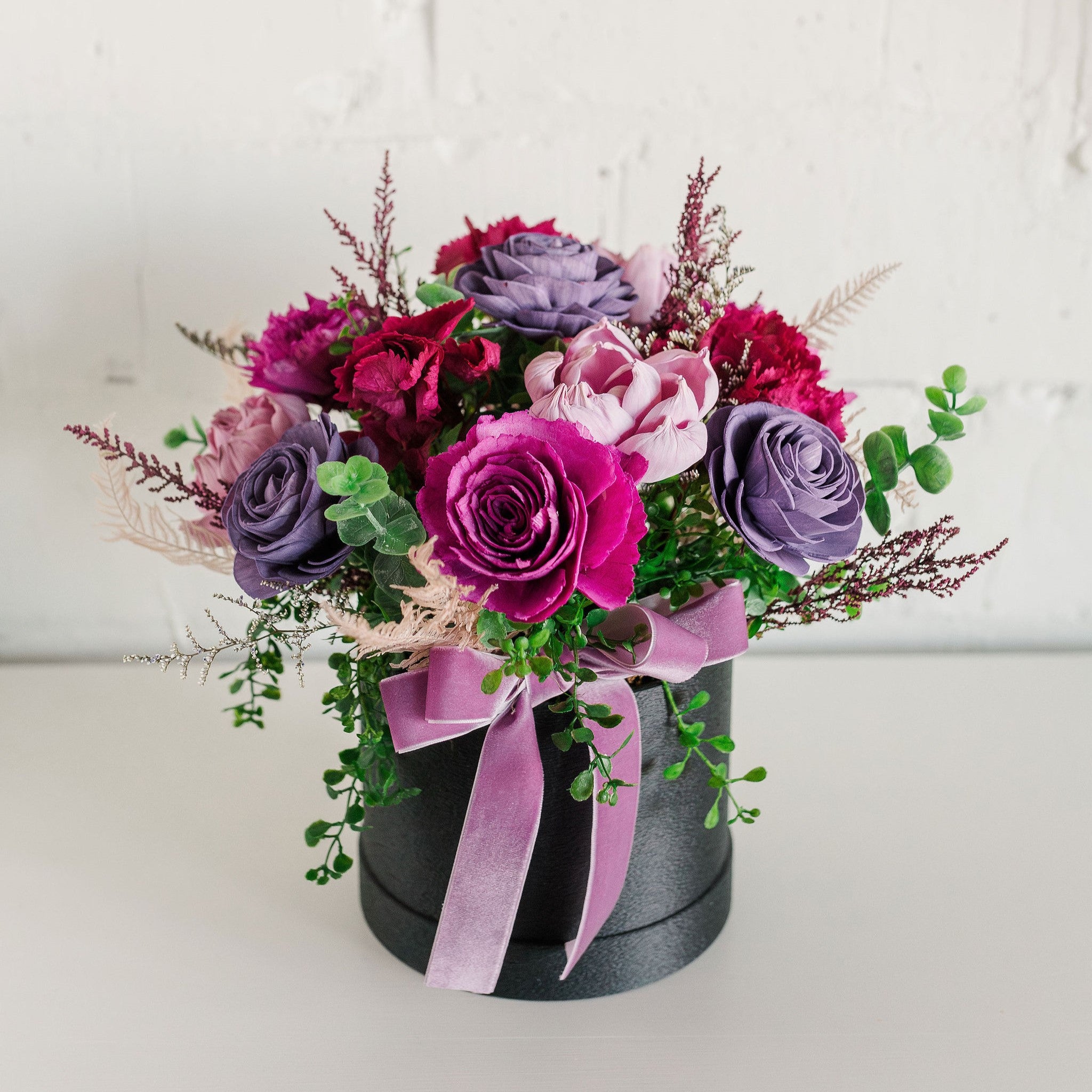 Experience the regal beauty of Her Majesty, a stunning flower arrangement featuring a mix of luxurious purple and pink flowers, elegantly displayed in a decorative black hat box with a delicate ribbon. Adorn your home or gift it to a loved one to add a touch of royal elegance to any space.