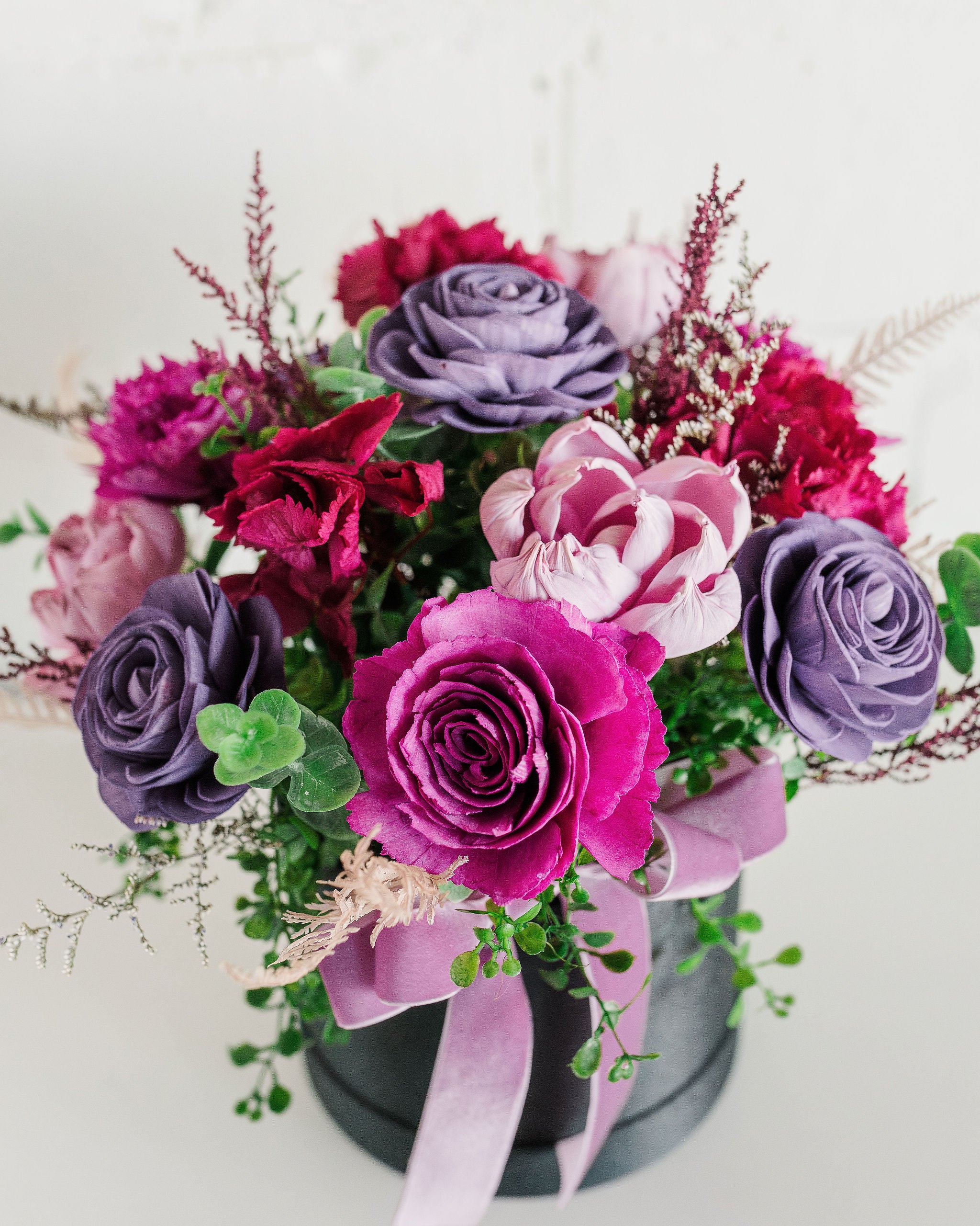We use any combination of sola wood, preserved, dried, and real-touch (faux) flowers and foliage. This combination truly lets us unleash creativity both in color and design. Never throw away flowers again! Your flowers can last a lifetime with proper care. For care and FAQ click here: CARE & FAQ