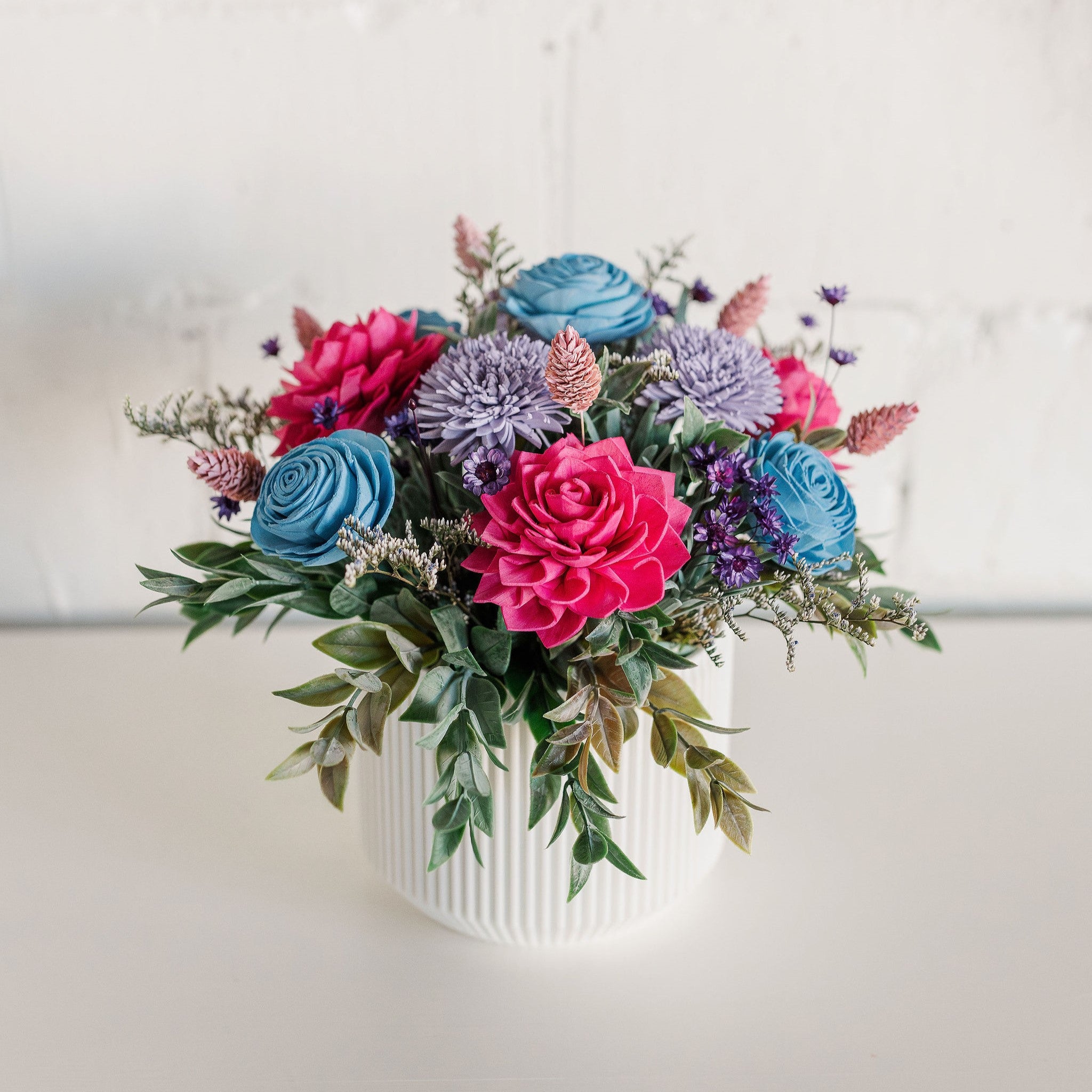 Morning Sky arrangement. This arrangement has beautiful sola wood flowers of dark pink, light pink, bright blue and lavender with complimentary foliage and fillers. Comes in a white ribbed pot.