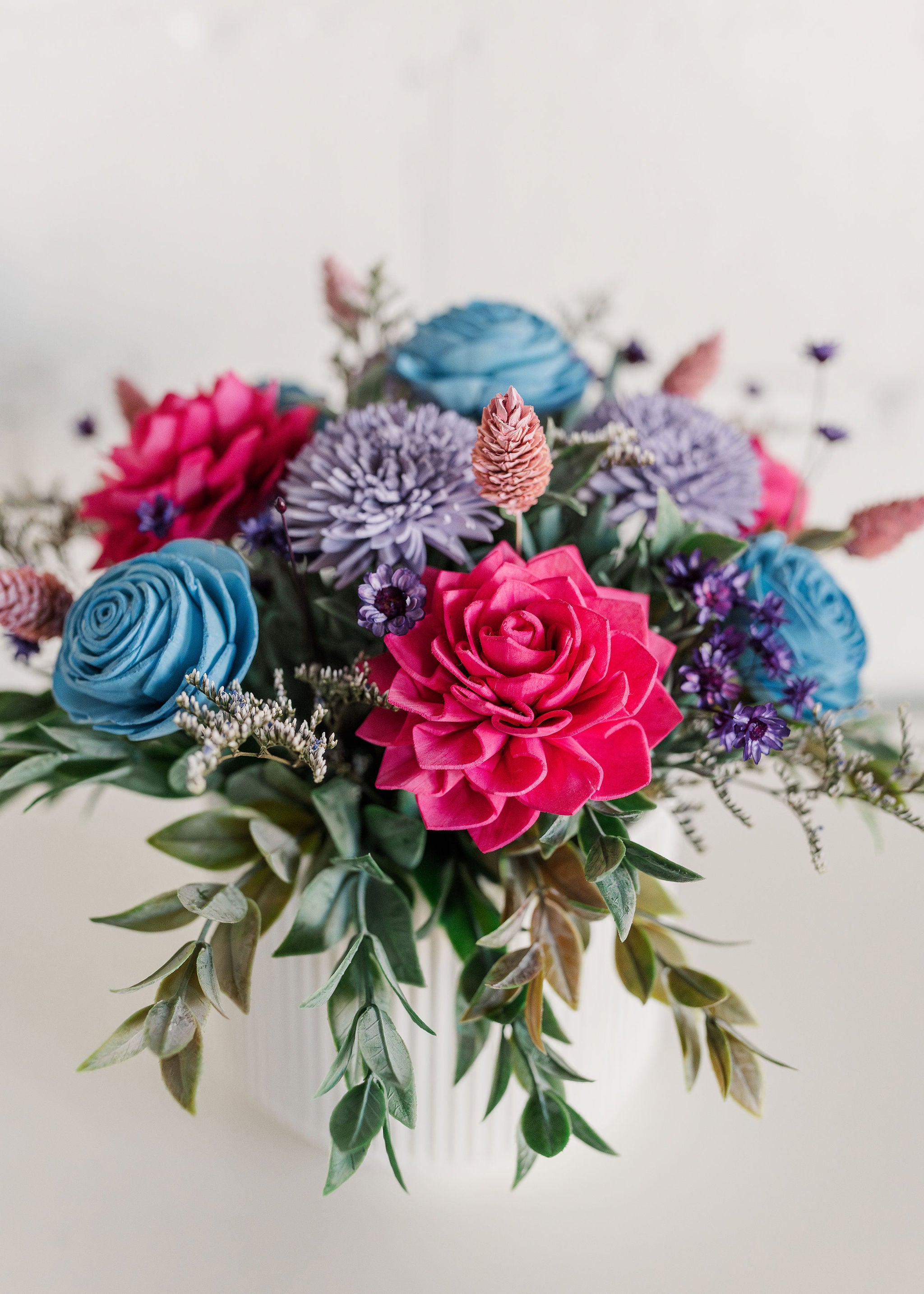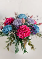 We use any combination of sola wood, preserved, dried, and real-touch (faux) flowers and foliage. This combination truly lets us unleash creativity both in color and design. Never throw away flowers again! Your flowers can last a lifetime with proper care. For care and FAQ click here: CARE & FAQ