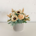 Natural Beauty arrangement. This arrangement has beautiful sola wood flowers of ivory, buff and wood with complimentary foliage and fillers. Comes in a ribbed pot.