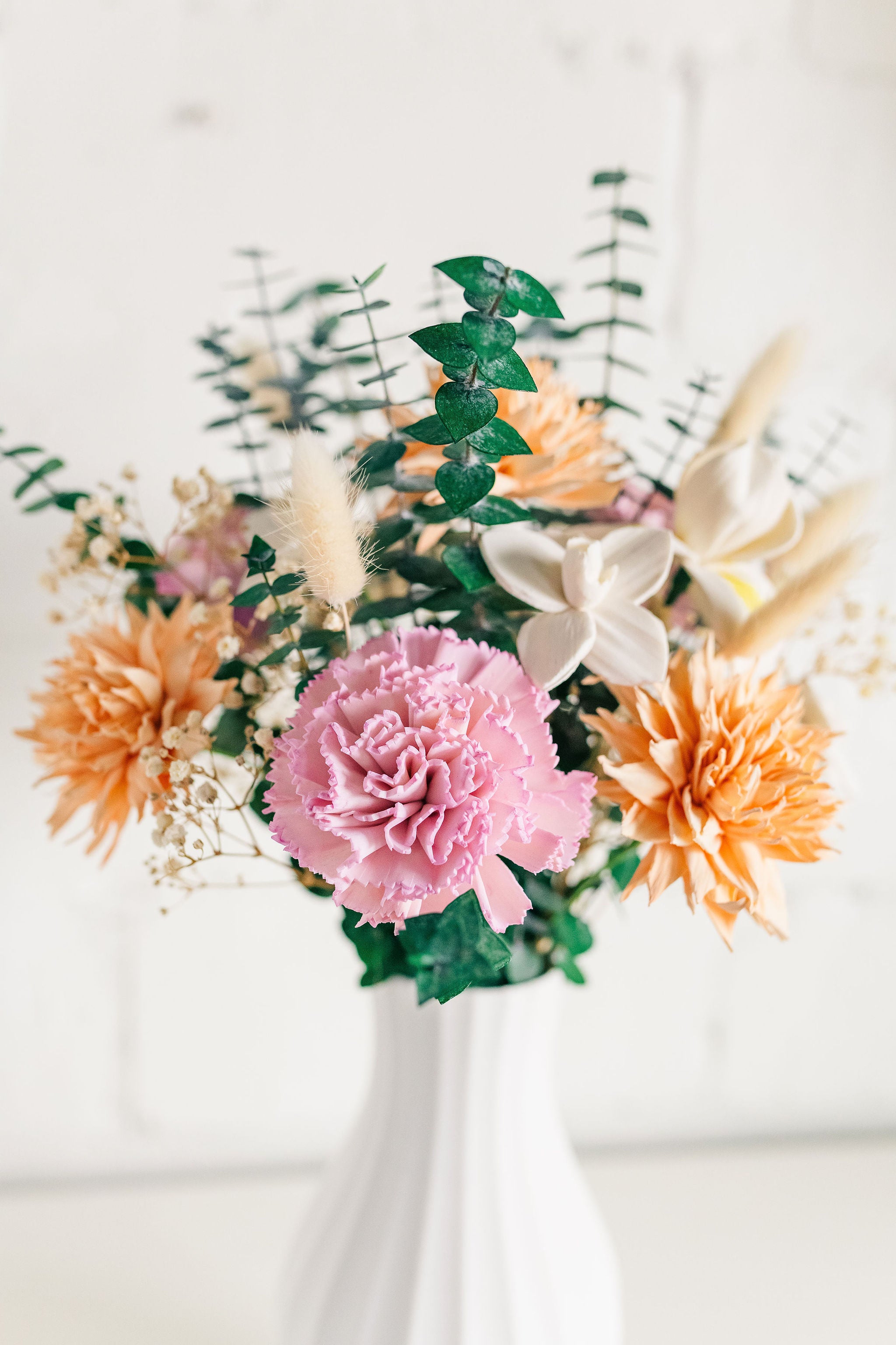 Birth Flower Vase arrangement. What better way to celebrate your family than to create a custom arrangement with their birth flowers? This photo is an example of our design, but your arrangement will look unique based on which months you pick. We chose a softer palette that looks good with any floral combination. Because these are made from wood, we can combine flowers from all seasons. This arrangement also includes complimentary eucalyptus and dried fillers in a white vase.