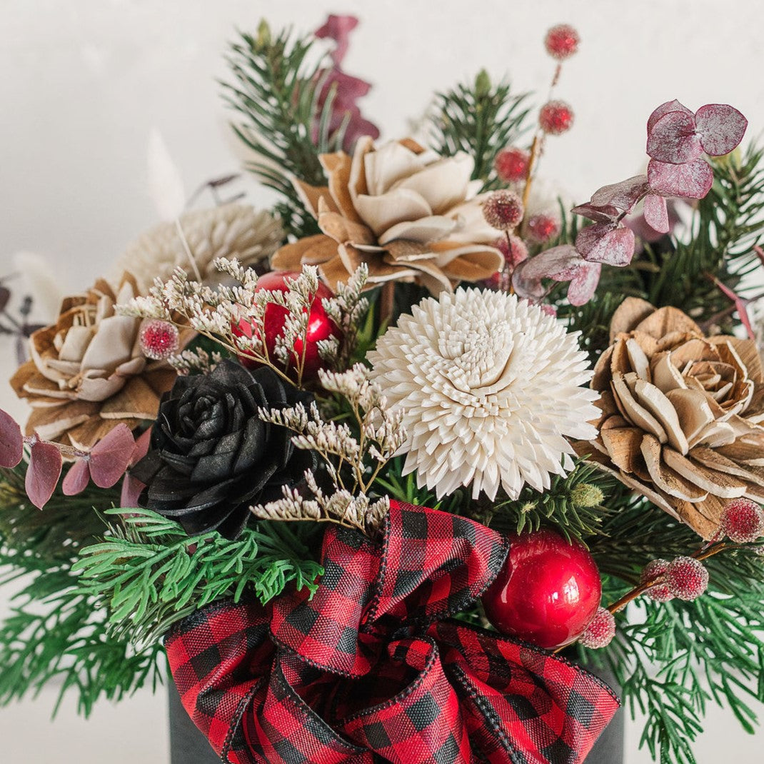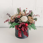 Welcome the holiday season with Cibolo Plaid, a beautiful Christmas flower arrangement. It's perfect for adding a festive touch to your home decor or gifting to loved ones. Get ready to spread some holiday cheer! Our Cibolo Plaid arrangement features sola wood and dried flowers of white, black, red, and wood bark in an exclusive black hat box and ribbon.