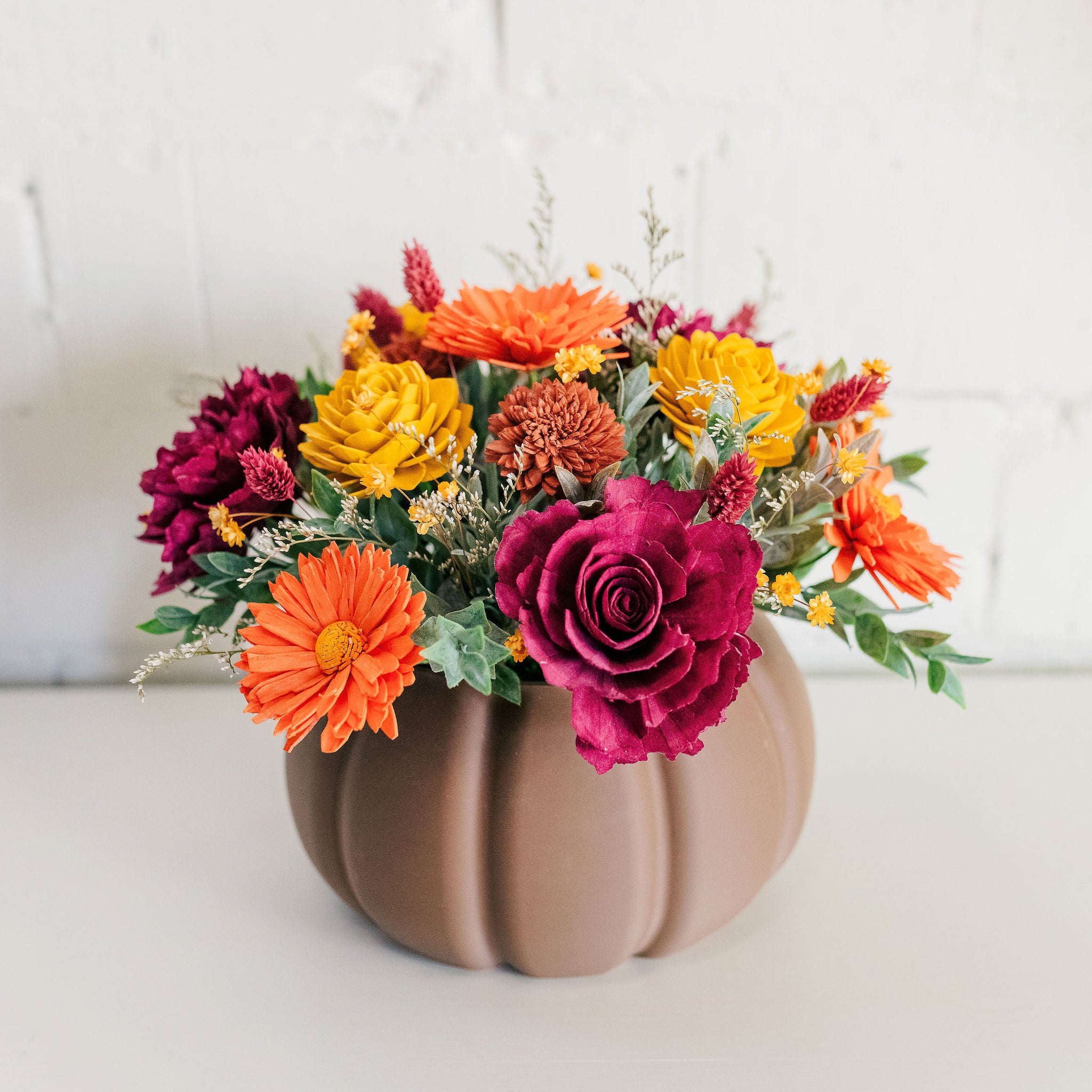 Welcome the warm and cozy feeling of fall with our pumpkin arrangement! Adorned with rich colors, this beautiful floral arrangement is the perfect addition to your autumn decor. Bring the beauty of the season into your home with this lovely piece. Our Golden Hour Pumpkin Arrangement features sola wood and dried flowers in orange, mustard yellow, burgundy and rust in an exclusive brown pumpkin pot.