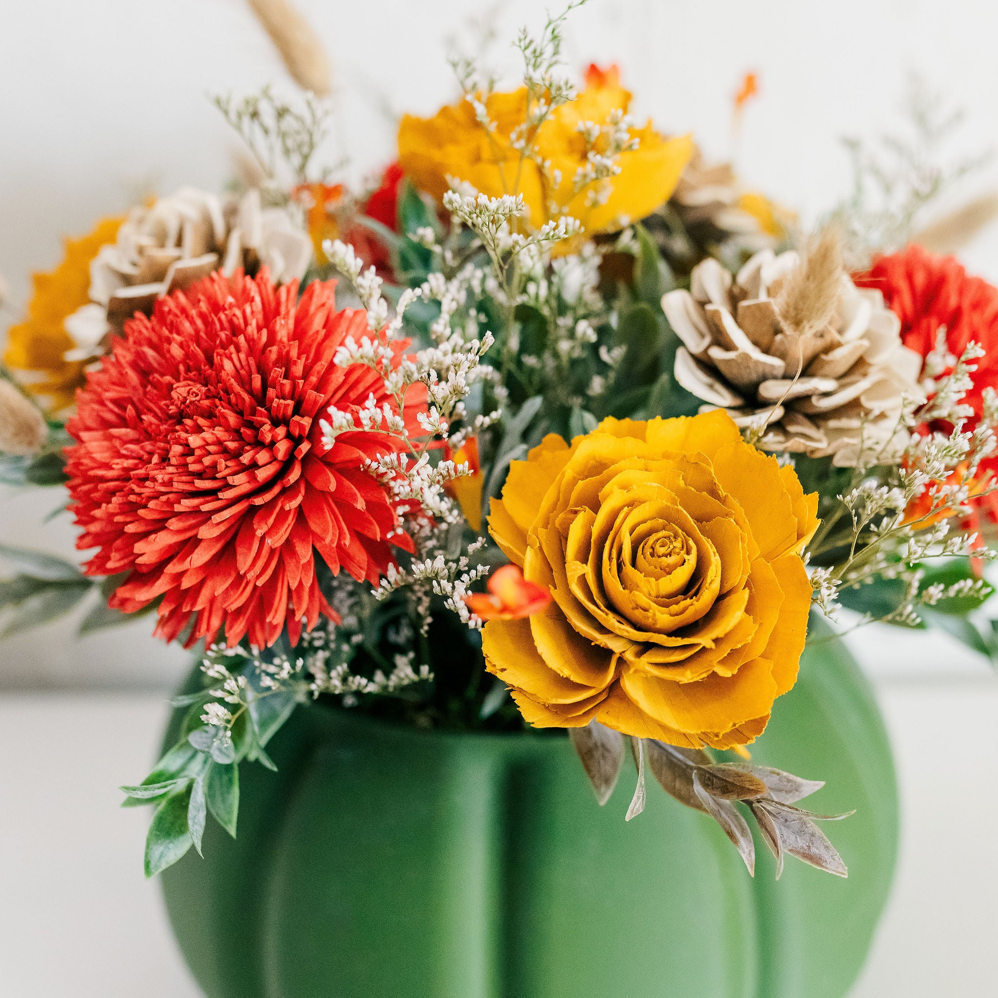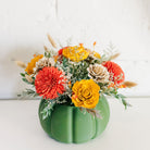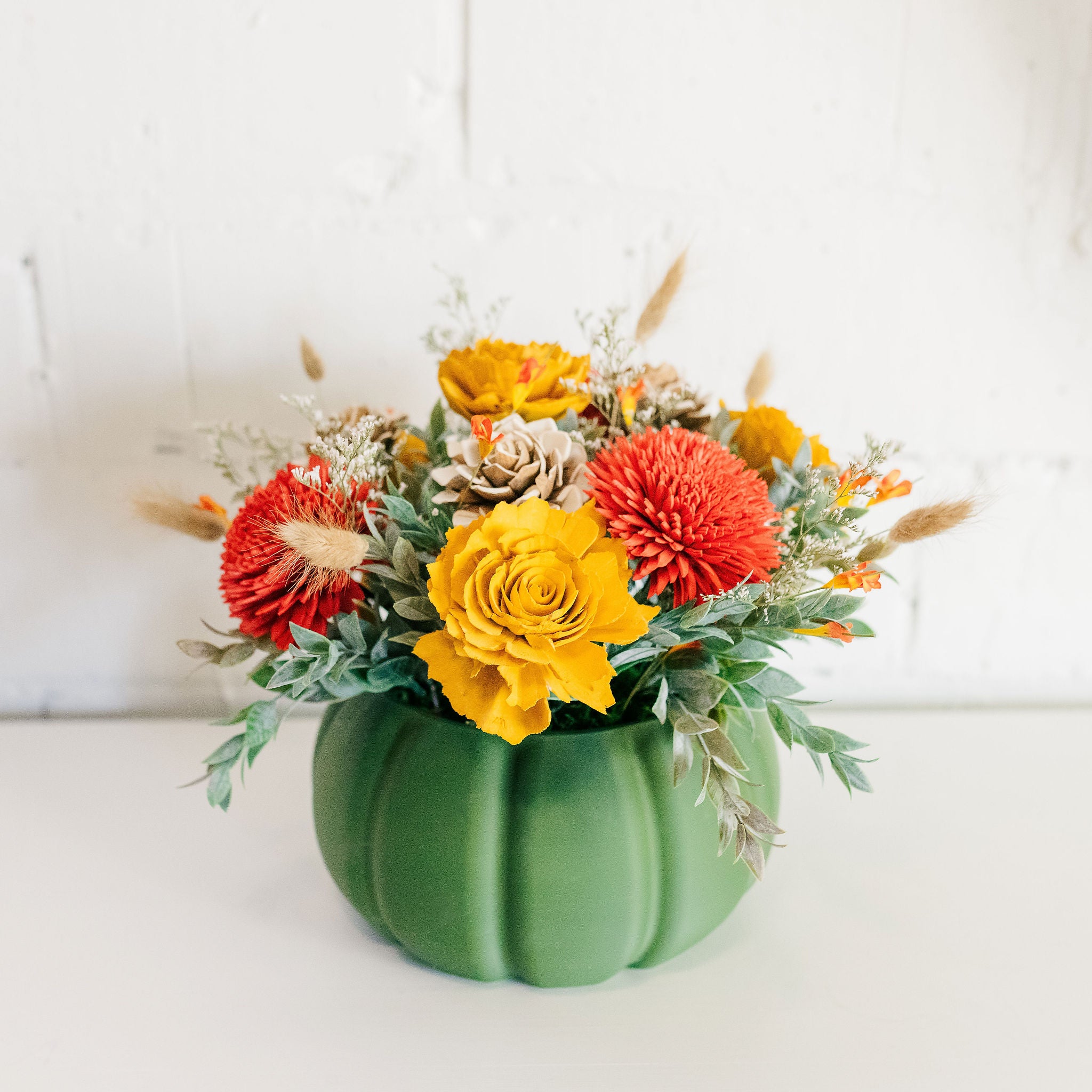 Welcome the warm and cozy feeling of fall with our pumpkin arrangement! Adorned with rich colors, this beautiful floral arrangement is the perfect addition to your autumn decor. Bring the beauty of the season into your home with this lovely piece. Our Harvest Pumpkin Arrangement features sola wood and dried flowers in burnt orange, mustard yellow, wood bark, tan, and orange in an exclusive army green pumpkin pot.