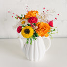 Morning Tea arrangement. This arrangement has beautiful sola wood flowers of red, yellow tangerine and white, with complimentary foliage and fillers. Comes in a white teapot.