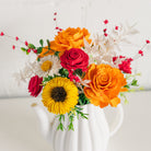 The arrangement pictured reflects our original design for this product. While we always follow the color palette, we may replace flowers and foliage depending on availability. Due to lighting when photos were taken and differences in screen appearances, products might appear lighter/darker or differ in color than actual physical products. Every arrangement is custom-made, and the placement of flowers may vary from the photos.