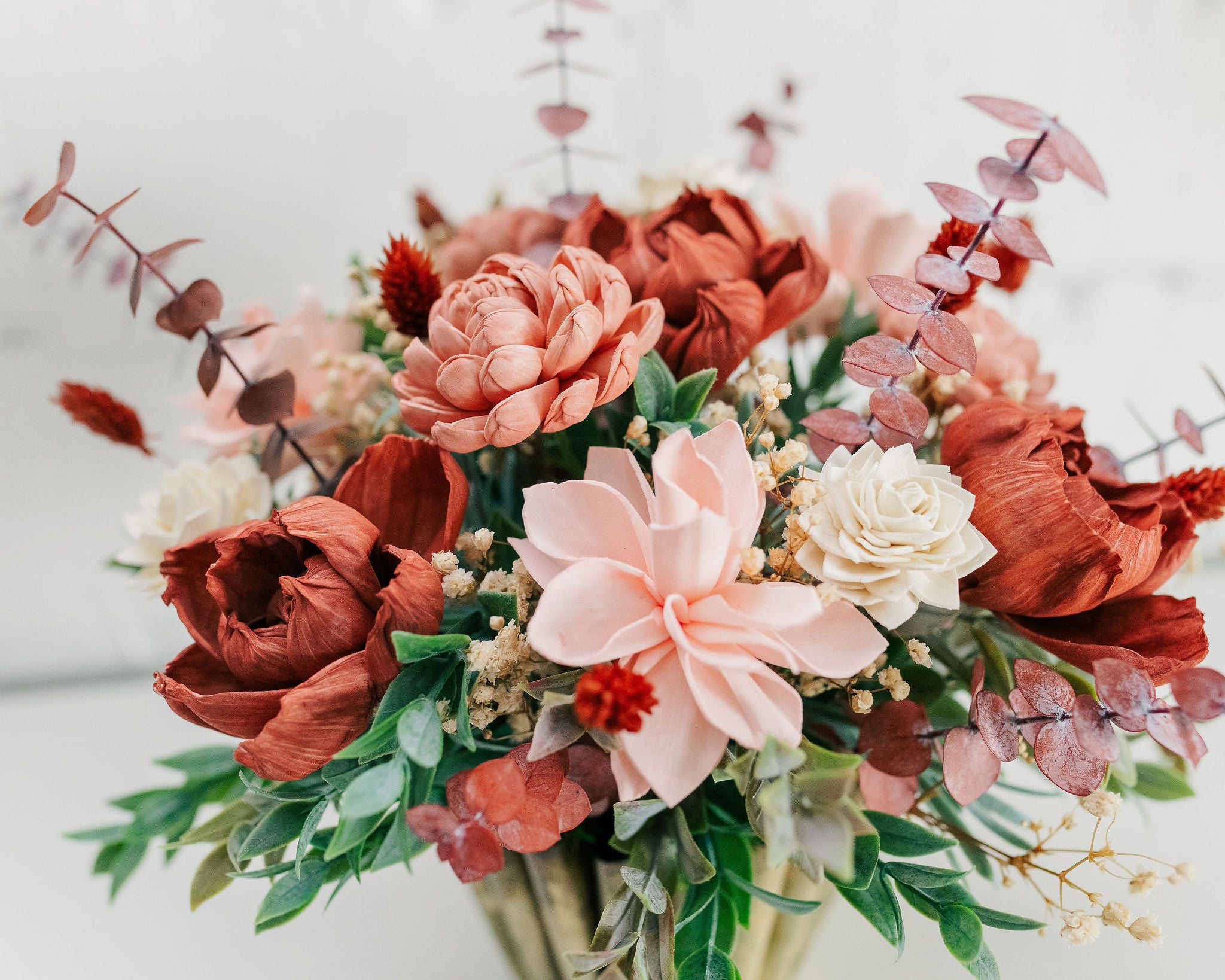 We use any combination of sola wood, preserved, dried, and real-touch (faux) flowers and foliage. This combination truly lets us unleash creativity both in color and design. Never throw away flowers again! Your flowers can last a lifetime with proper care. For care and FAQ click here: CARE & FAQ