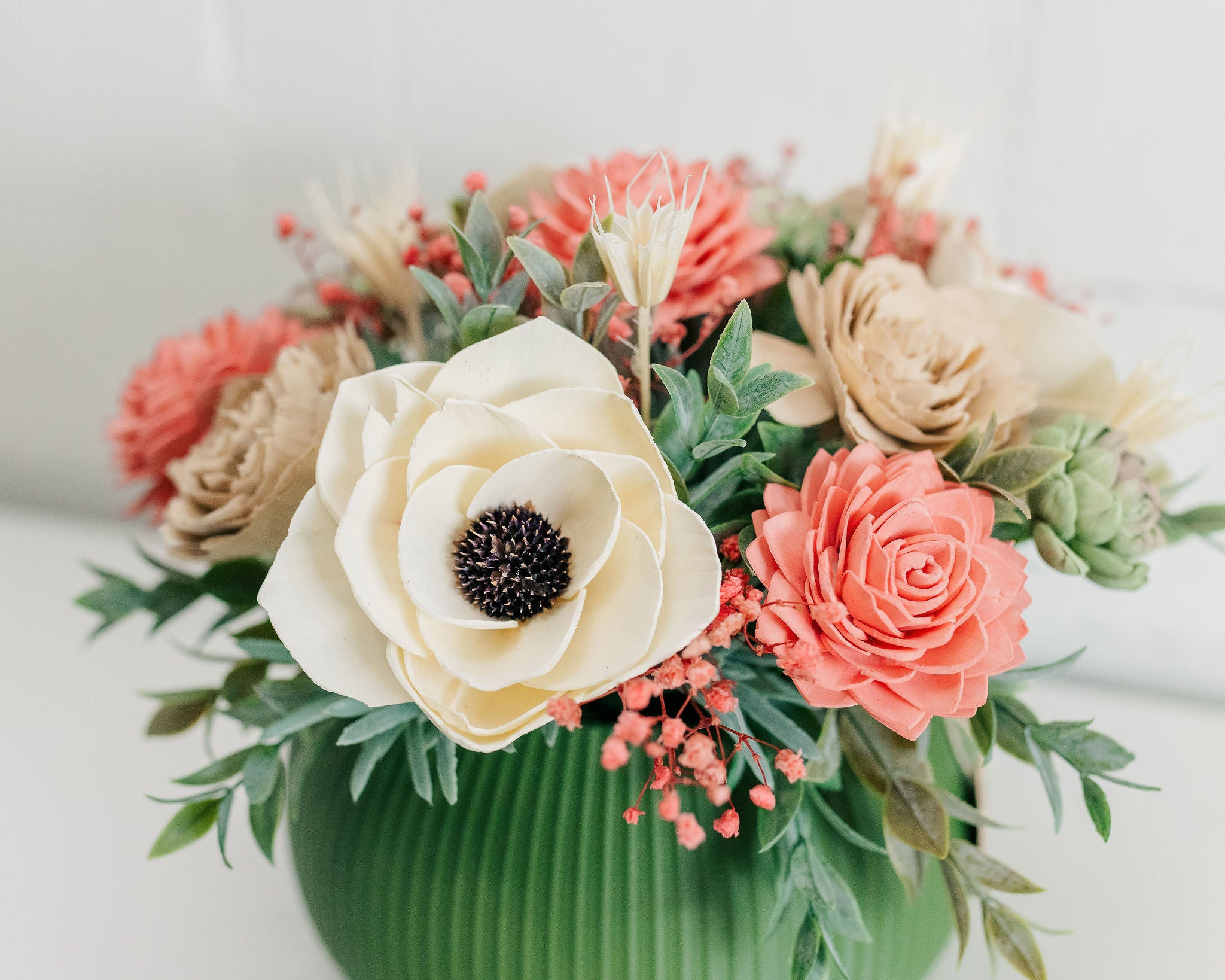 We use any combination of sola wood, preserved, dried, and real-touch (faux) flowers and foliage. This combination truly lets us unleash creativity both in color and design. Never throw away flowers again! Your flowers can last a lifetime with proper care. For care and FAQ click here: CARE & FAQ