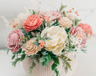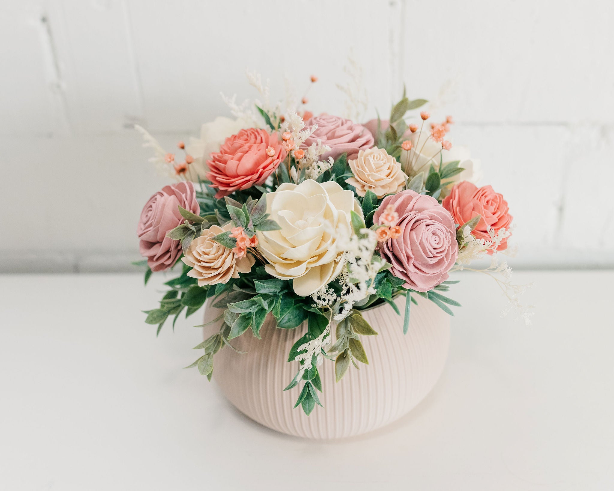 Southern Charm arrangement. This arrangement has beautiful sola wood flowers of dusty rose, ivory, crushed coral and cream with complimentary foliage and filler. Comes in a cream ribbed pot.