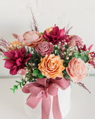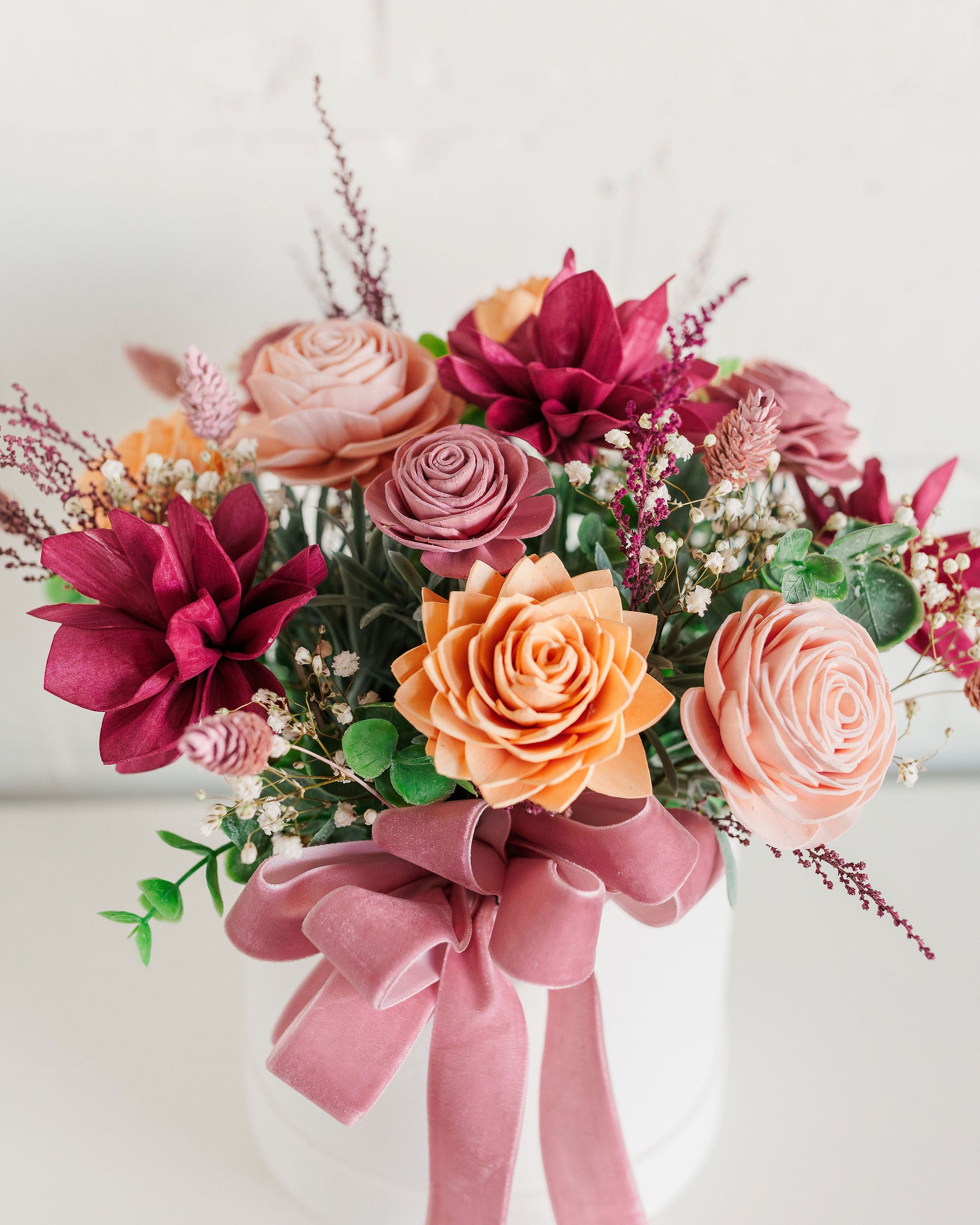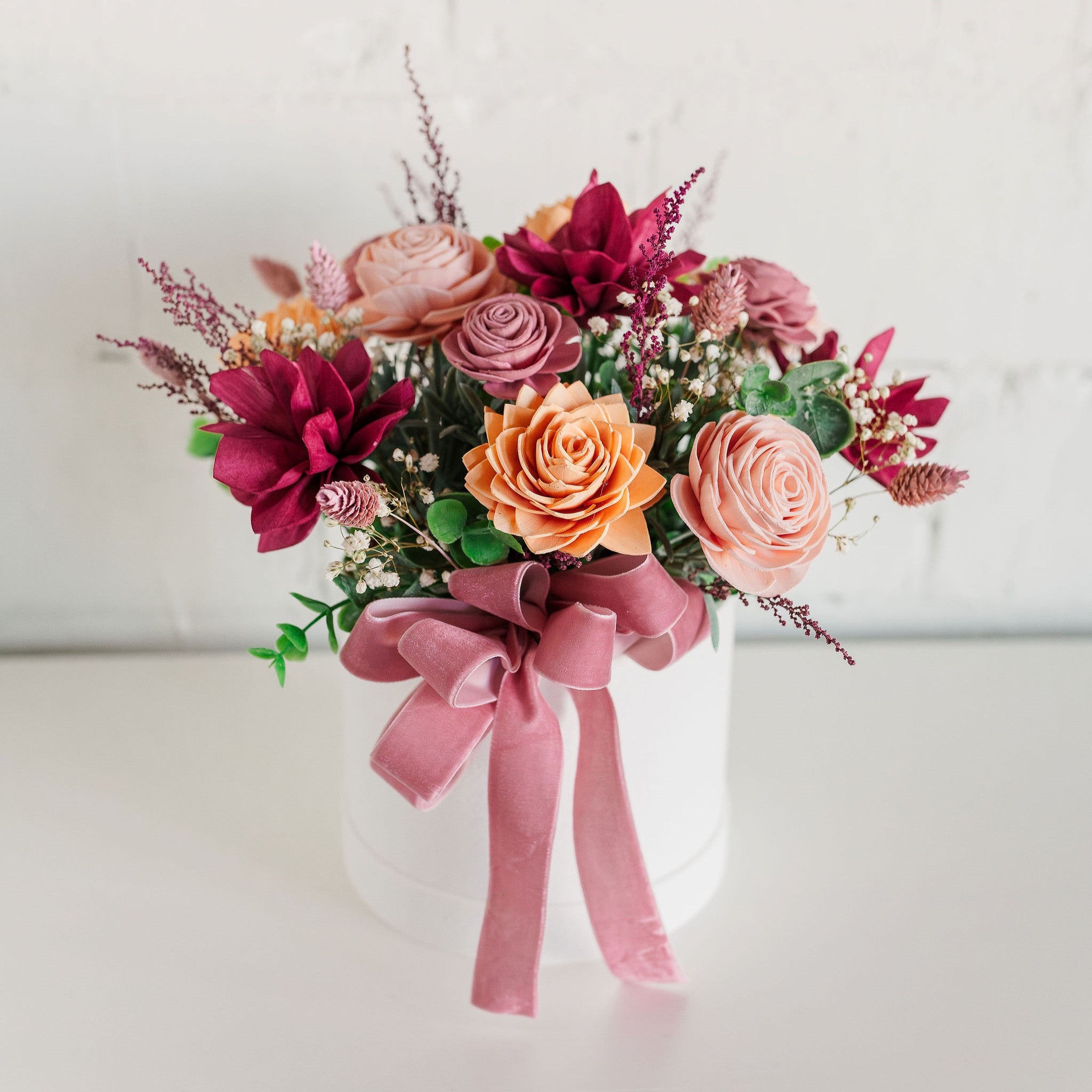 Experience the beauty and elegance of our Sparkling Rose' flower arrangement! Peach, blush, cranberry, and soft pink wood flowers come together in a stunning display, accented with dried fillers. Arranged in a white hat box with ribbon, this arrangement is perfect for adding a touch of beauty to any space.