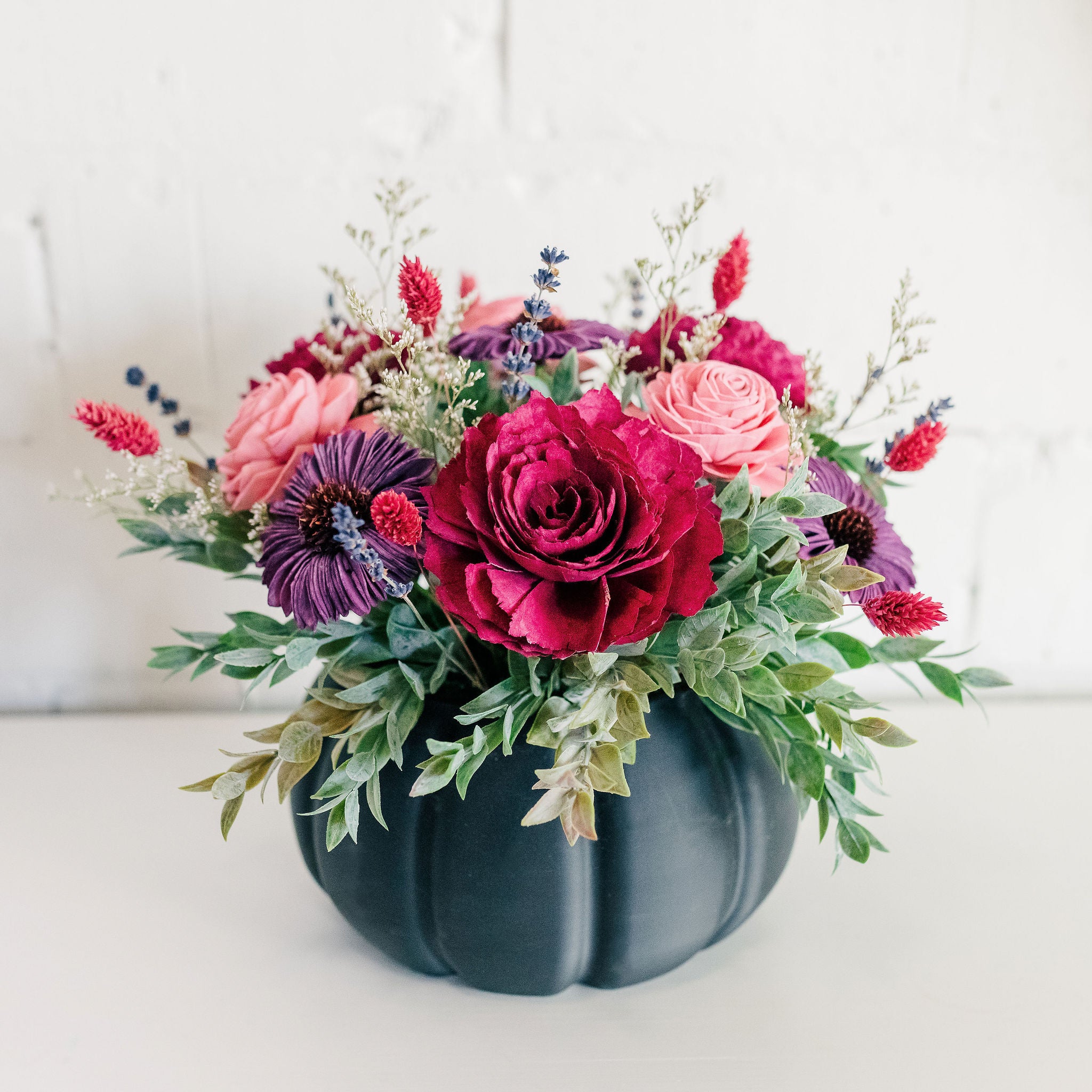 Welcome the warm and cozy feeling of fall with our pumpkin arrangement! Adorned with rich colors, this beautiful floral arrangement is the perfect addition to your autumn decor. Bring the beauty of the season into your home with this lovely piece. Our Vintage Wine Pumpkin Arrangement features sola wood and dried flowers in plum, burgundy, vintage pink and purple in an exclusive black pumpkin pot.