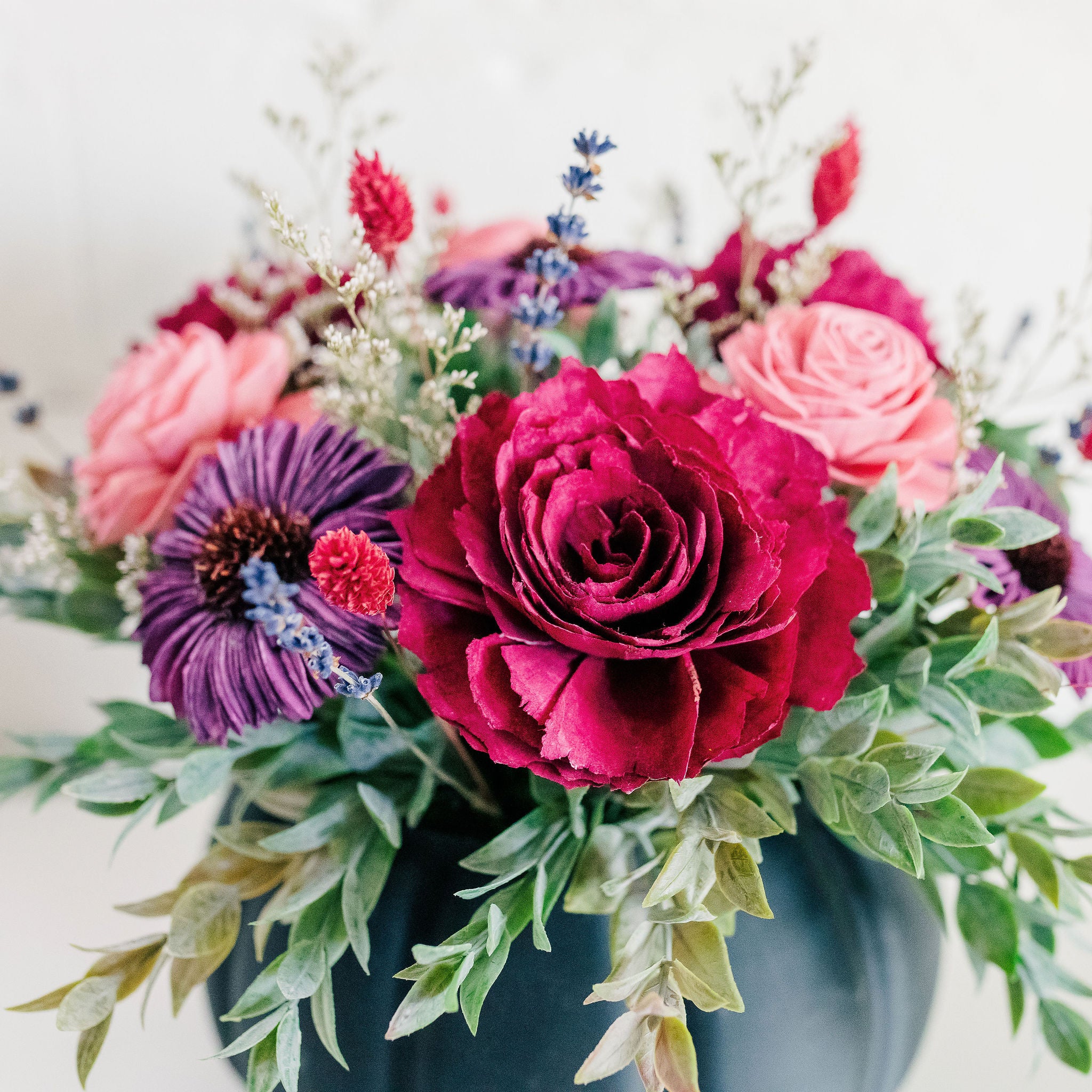 We use any combination of sola wood, preserved, dried, and real-touch (faux) flowers and foliage. This combination truly lets us unleash creativity both in color and design. Never throw away flowers again! Your flowers can last a lifetime with proper care. For care and FAQ click here: CARE & FAQ