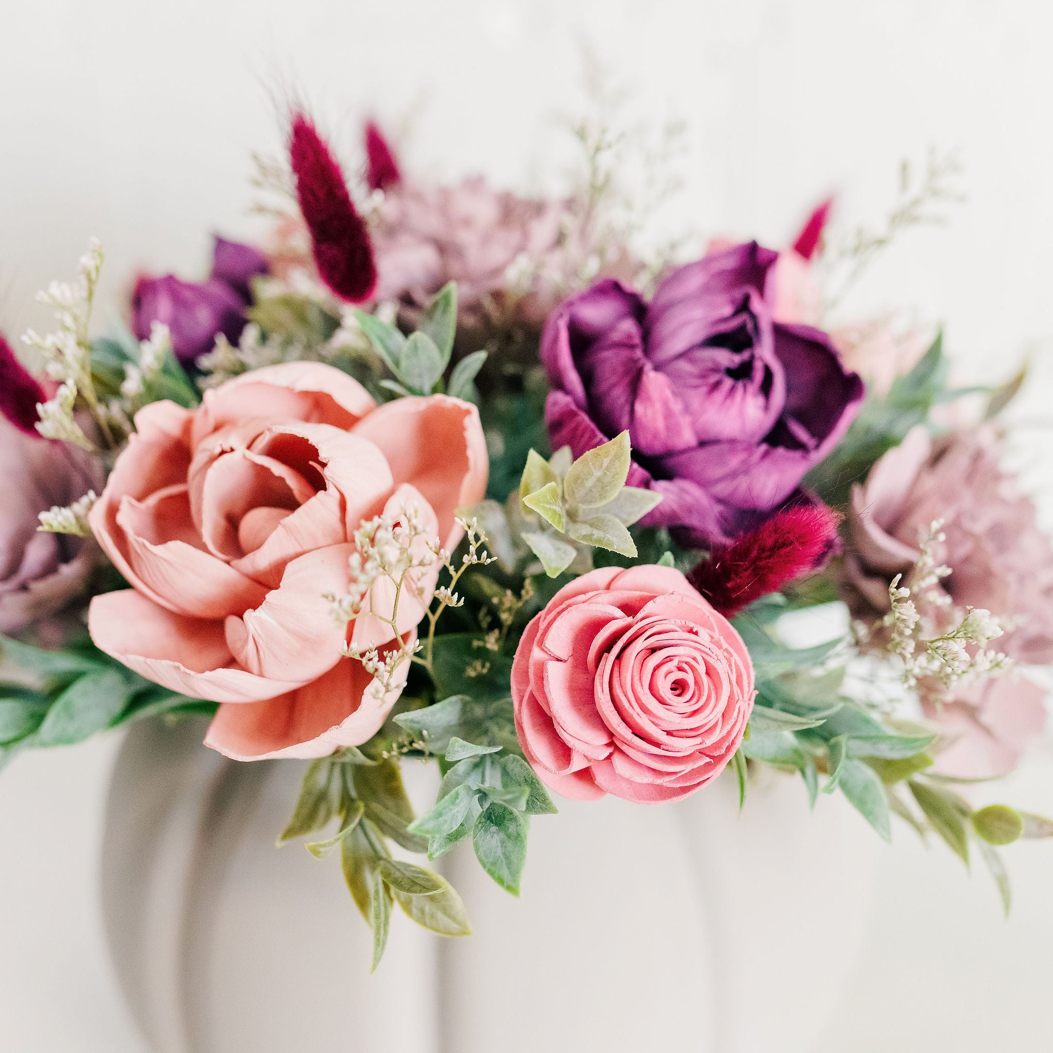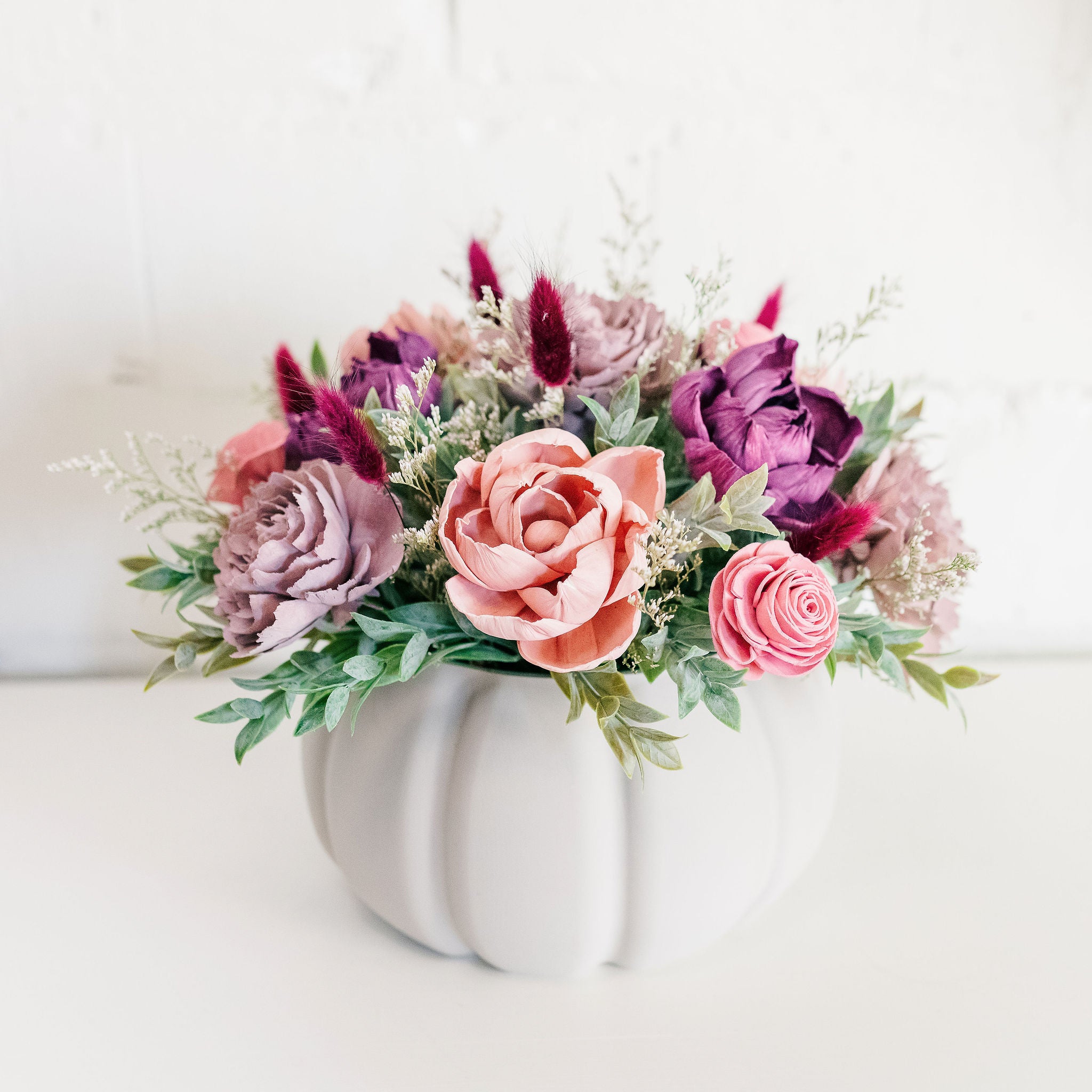 Welcome the warm and cozy feeling of fall with our pumpkin arrangement! Adorned with rich colors, this beautiful floral arrangement is the perfect addition to your autumn decor. Bring the beauty of the season into your home with this lovely piece. Our Violet Haze Pumpkin Arrangement features sola wood and dried flowers in plum, lilac, dusty rose and vintage pink in an exclusive griege pumpkin pot.