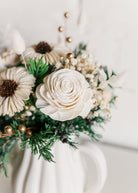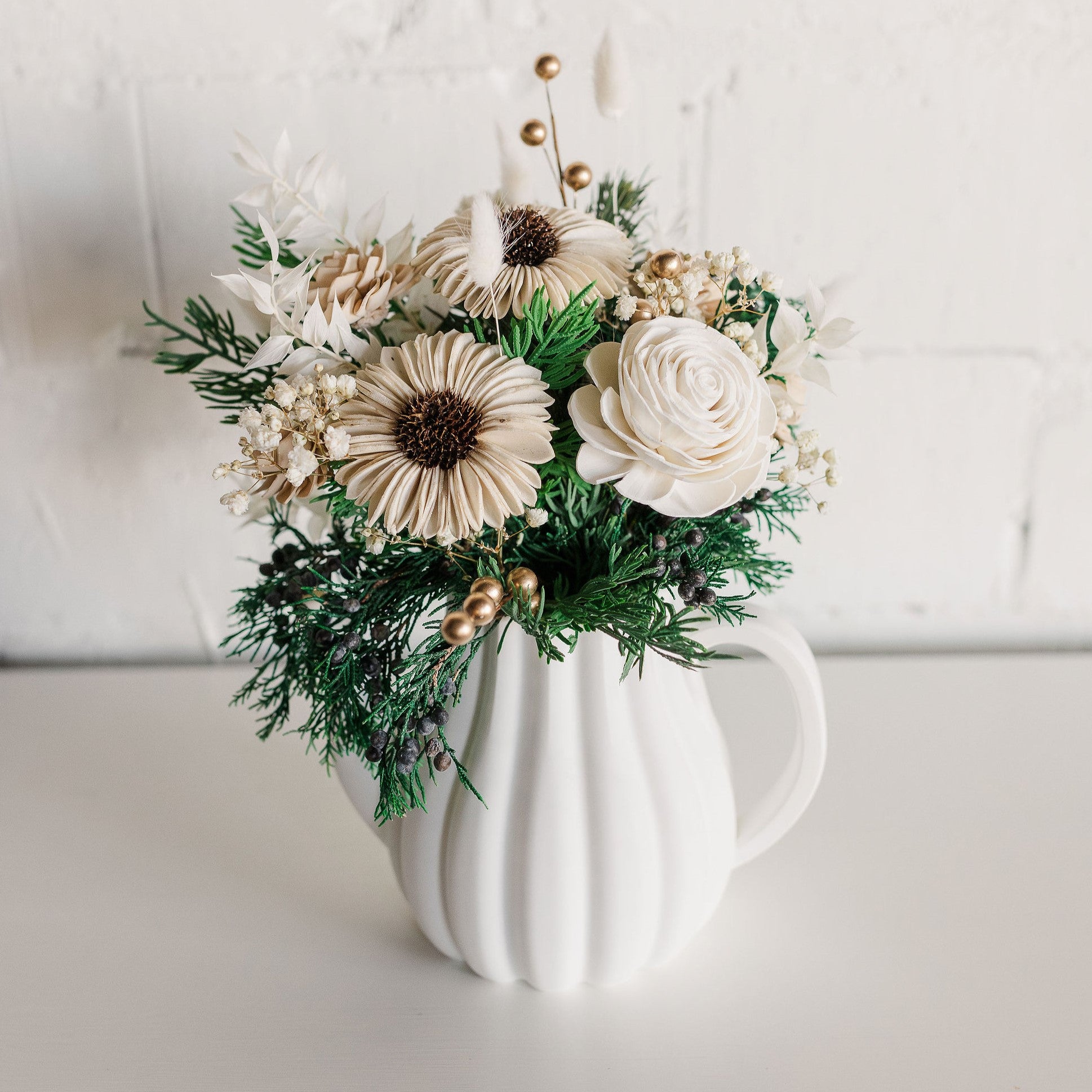 Welcome the holiday season with White Spice Tea, a beautiful Christmas flower arrangement. It's perfect for adding a festive touch to your home decor or gifting to loved ones. Get ready to spread some holiday cheer! Our White Spice Tea arrangement features sola wood and dried flowers of white, ivory, and gold in an exclusive white teapot.