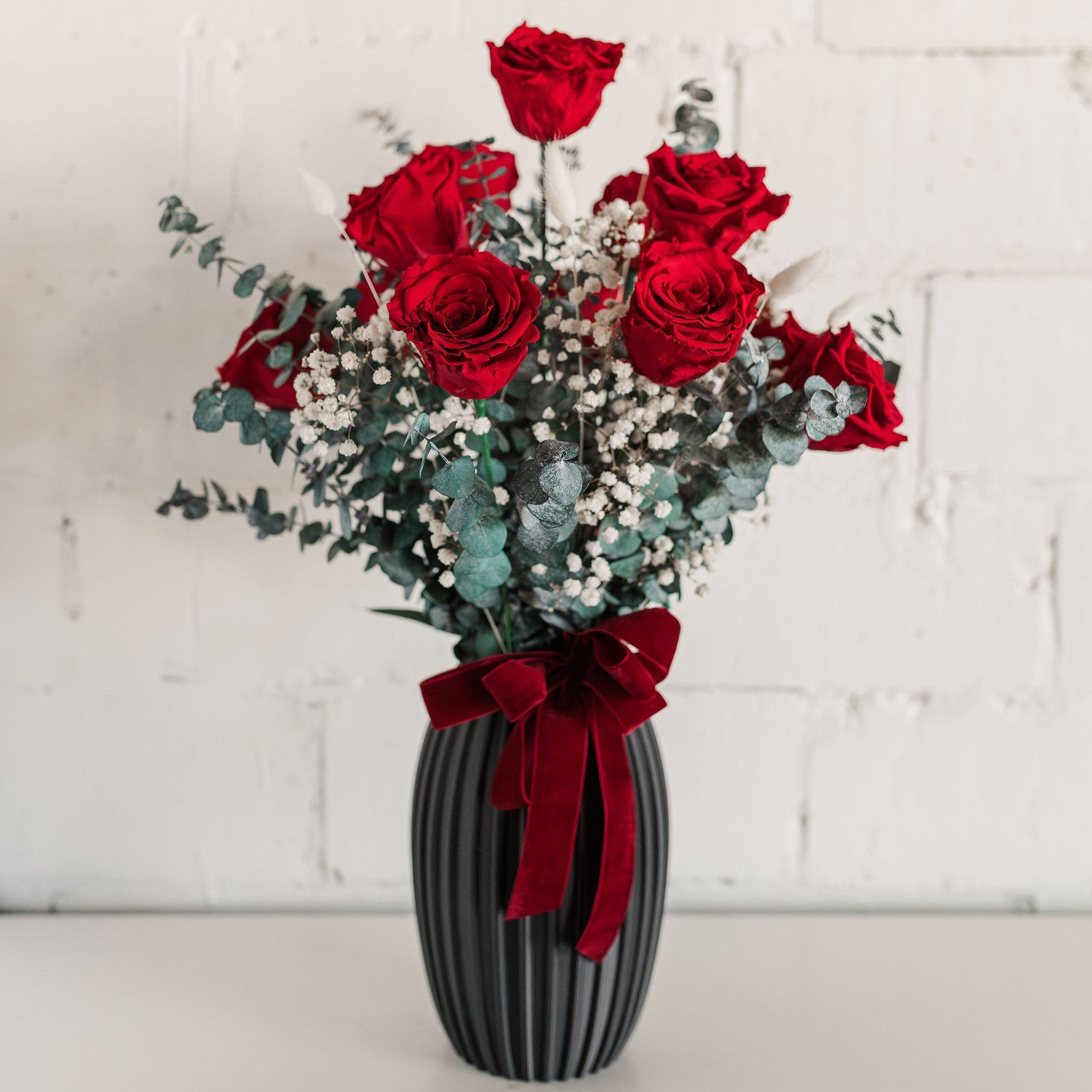 One dozen preserved real roses arranged with preserved eucalyptus and baby's breath. This arrangement has beautiful red roses with complimentary foliage and filler. Comes in a ribbed black vase with a complimentary red bow.