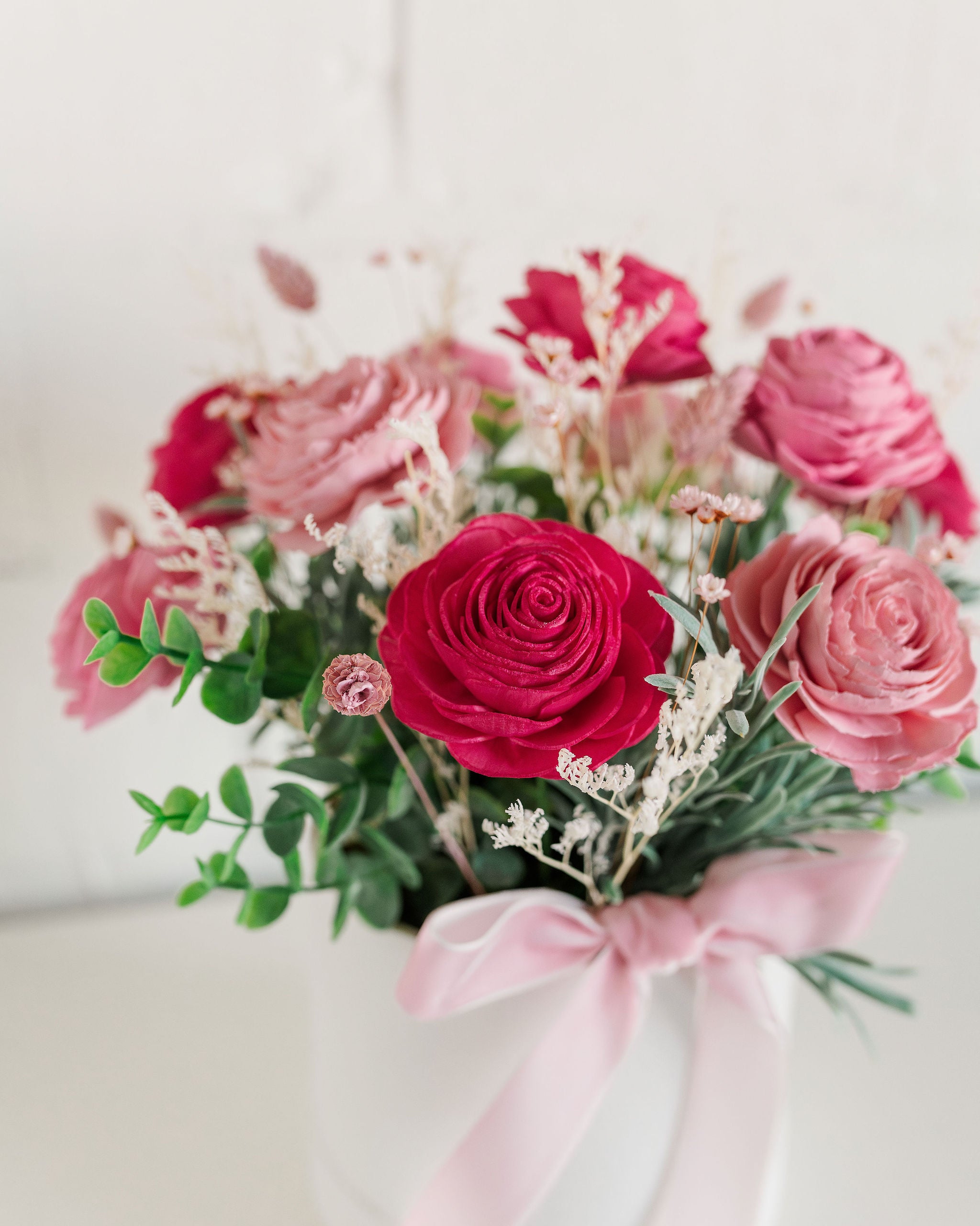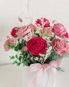 Add a touch of sweetness to any space with the Shirley Temple flower arrangement. With dark and light pink roses, a white hat box, ribbon, and dried filler flowers, this bouquet is a charmingly unique choice. Perfect for adding a playful pop to any room (and guaranteed to make you smile)!