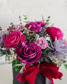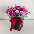 Indulge in the exquisite beauty of our You're a Gem flower arrangement. Adorned with vibrant purple and pink flowers, accented with dried fillers, and presented in a stylish black hat box with a luxurious ribbon, this arrangement is truly a gem. Elevate any space with its elegance and charm.