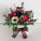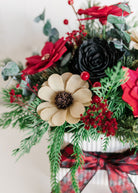 Welcome the holiday season with Comfy & Cozy, a beautiful Christmas flower arrangement. It's perfect for adding a festive touch to your home decor or gifting to loved ones. Get ready to spread some holiday cheer! Our Comfy & Cozy Arrangement features sola wood and dried flowers of black, red, and natural in an exclusive white box and ribbon.
