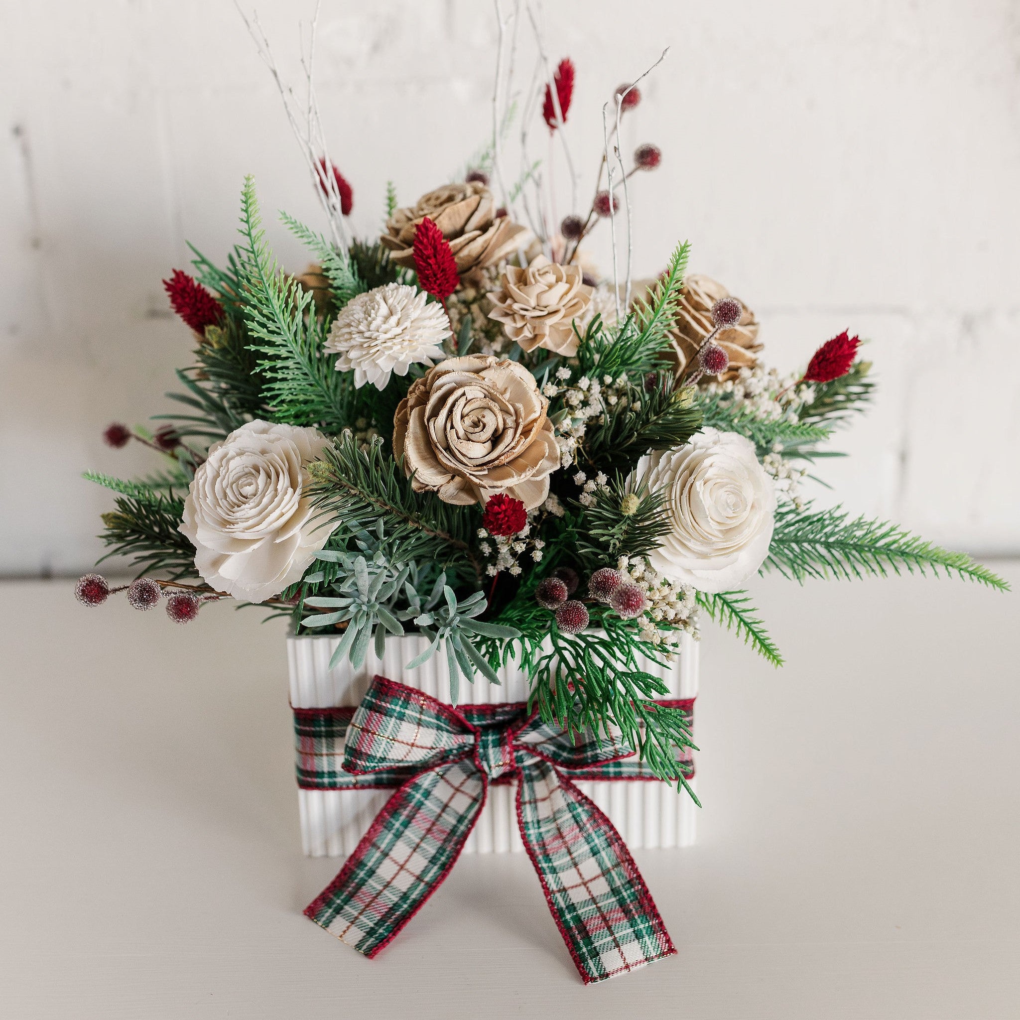Welcome the holiday season with Frosty Air, a beautiful Christmas flower arrangement. It's perfect for adding a festive touch to your home decor or gifting to loved ones. Get ready to spread some holiday cheer! Our Frosty Air Arrangement features sola wood and dried flowers of white, red and bark in an exclusive white box and ribbon.