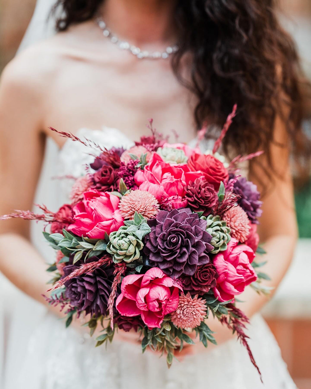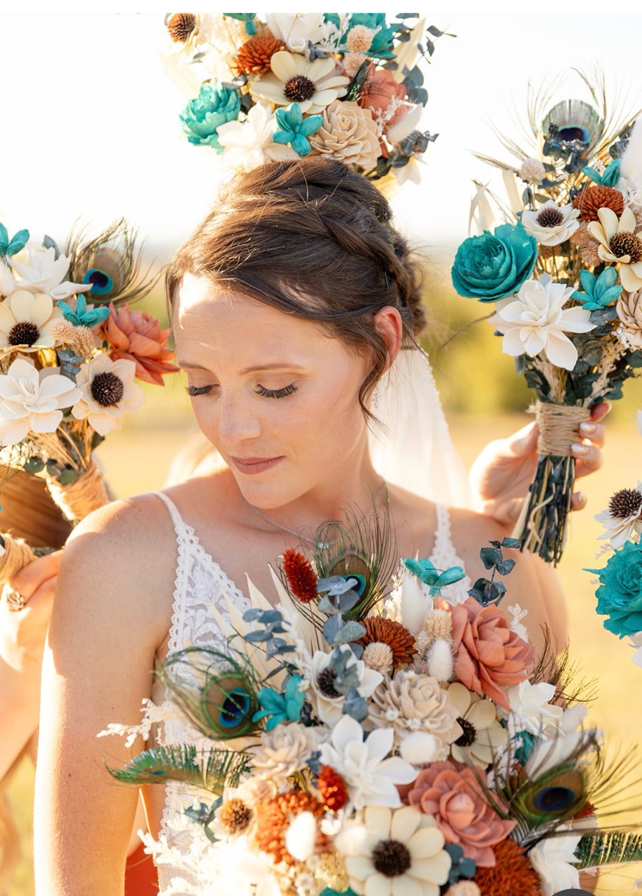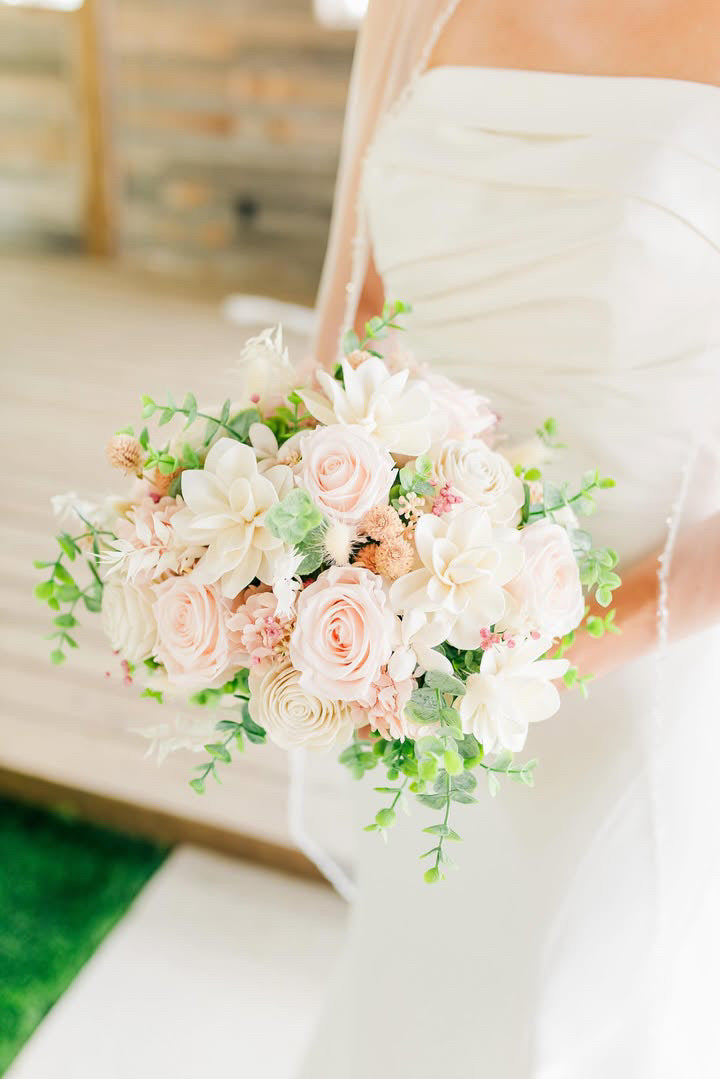You are unique and your wedding should be too! At Coco LeFor, we want to work with you to bring out the beauty of your story through flowers. We are different because we work with sola wood, preserved, dried & real-touch flowers. Not only will you have unique flowers on your big day, but they can be enjoyed for years to come! Most people are surprised to learn that these are not fresh flowers which is such a great complement! Sola wood flowers are hand-made, sustainable and can be hand-painted almost any color. We also use gorgeous real preserved roses from Ecuador that are vibrant, delicate and look like they were just picked from the garden! They have been specially preserved to last for years if cared for properly. Our bouquets are super lightweight because they don’t hold any water and are virtually scent free (with the exception of eucalyptus, lavender and some preserved flowers) so those with sensitivities to flowers don’t have to worry. However, you can add a sweet scent to your flowers if you desire!