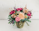 We use any combination of sola wood, preserved, dried, and real-touch (faux) flowers and foliage. This combination truly lets us unleash creativity both in color and design. Never throw away flowers again! Your flowers can last a lifetime with proper care. For care and FAQ click here: CARE & FAQ