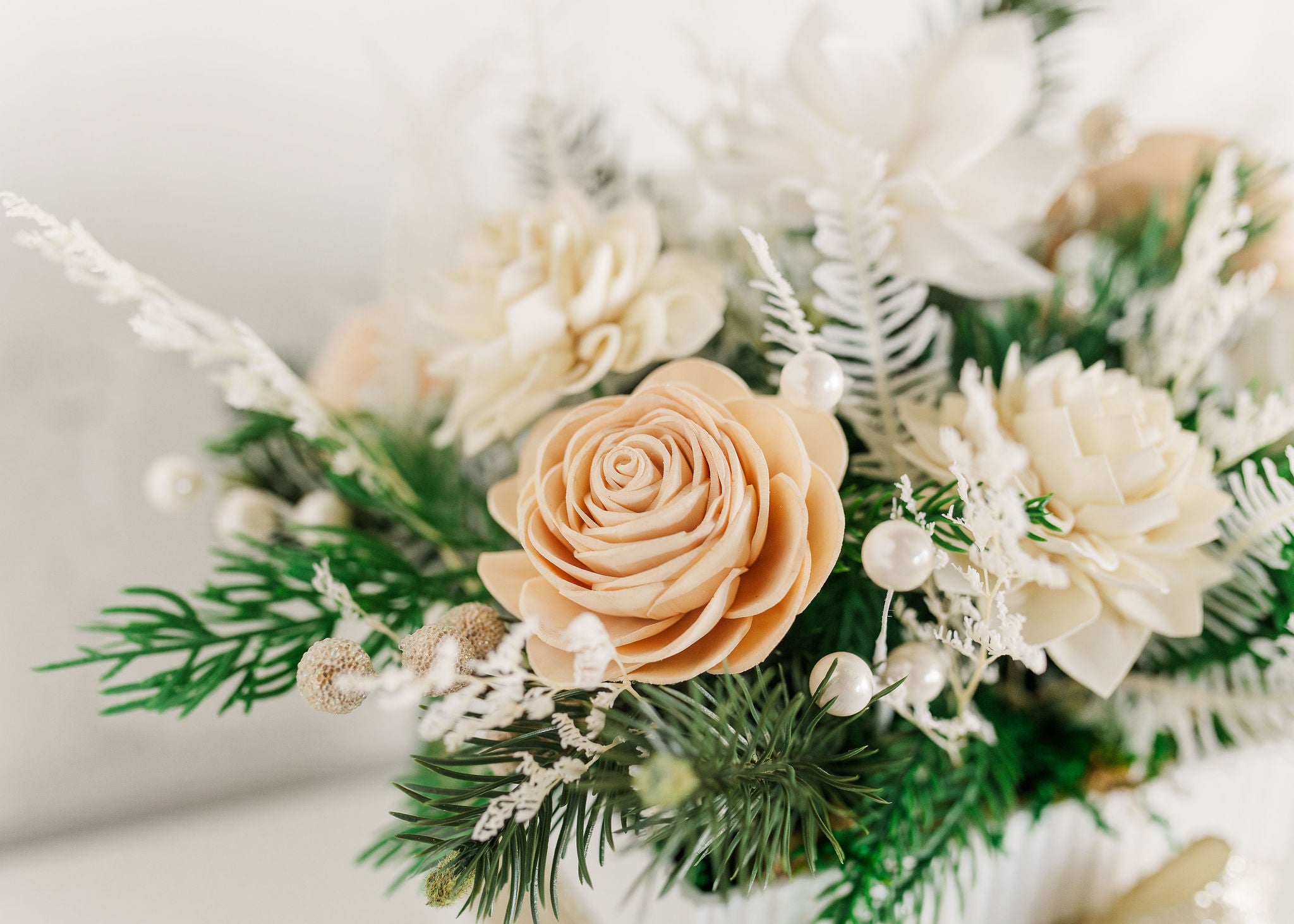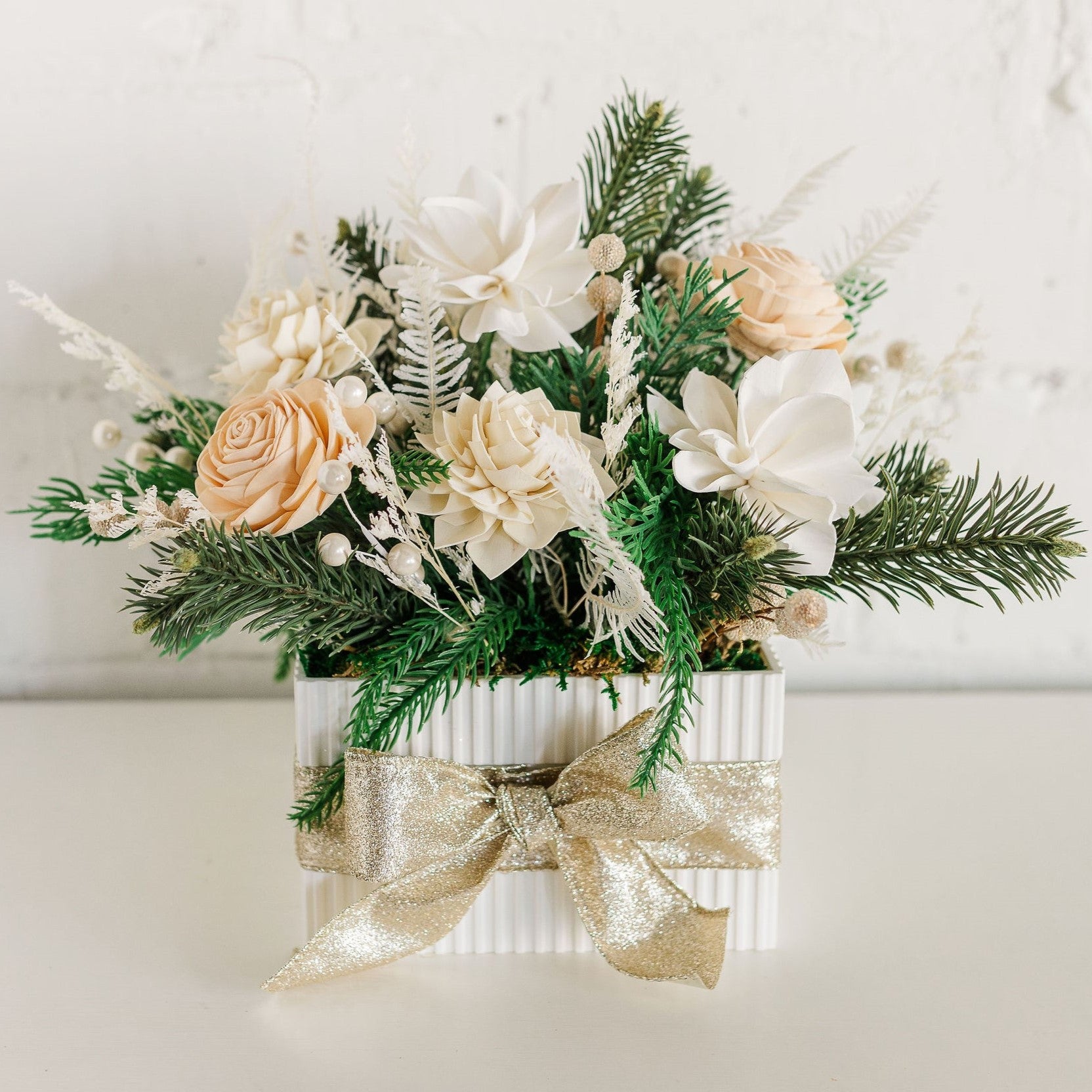 Welcome the holiday season with Hark the Herald, a beautiful Christmas flower arrangement. It's perfect for adding a festive touch to your home decor or gifting to loved ones. Get ready to spread some holiday cheer! Our Hark the Herald Arrangement features sola wood and dried flowers of ivory, white, beige pearl, and gold in an exclusive white box and ribbon.