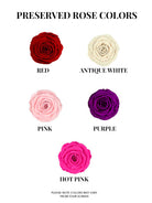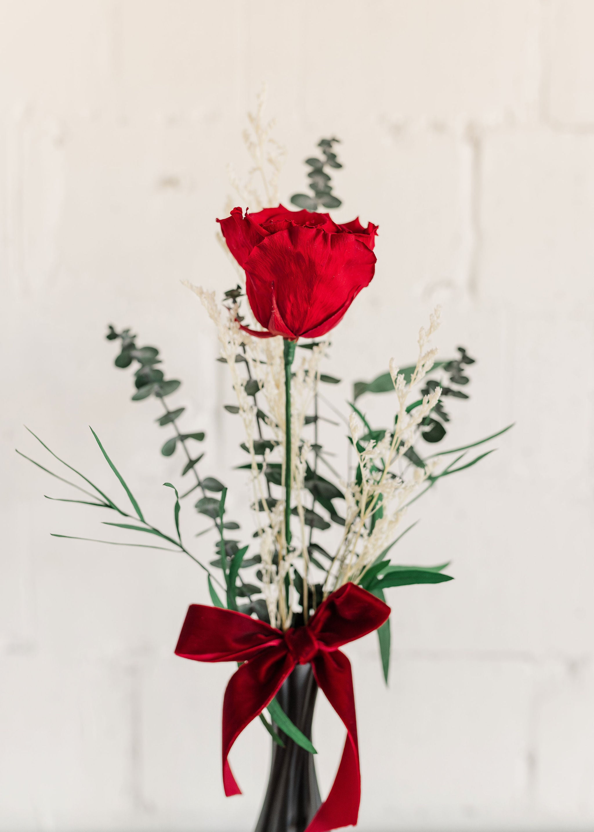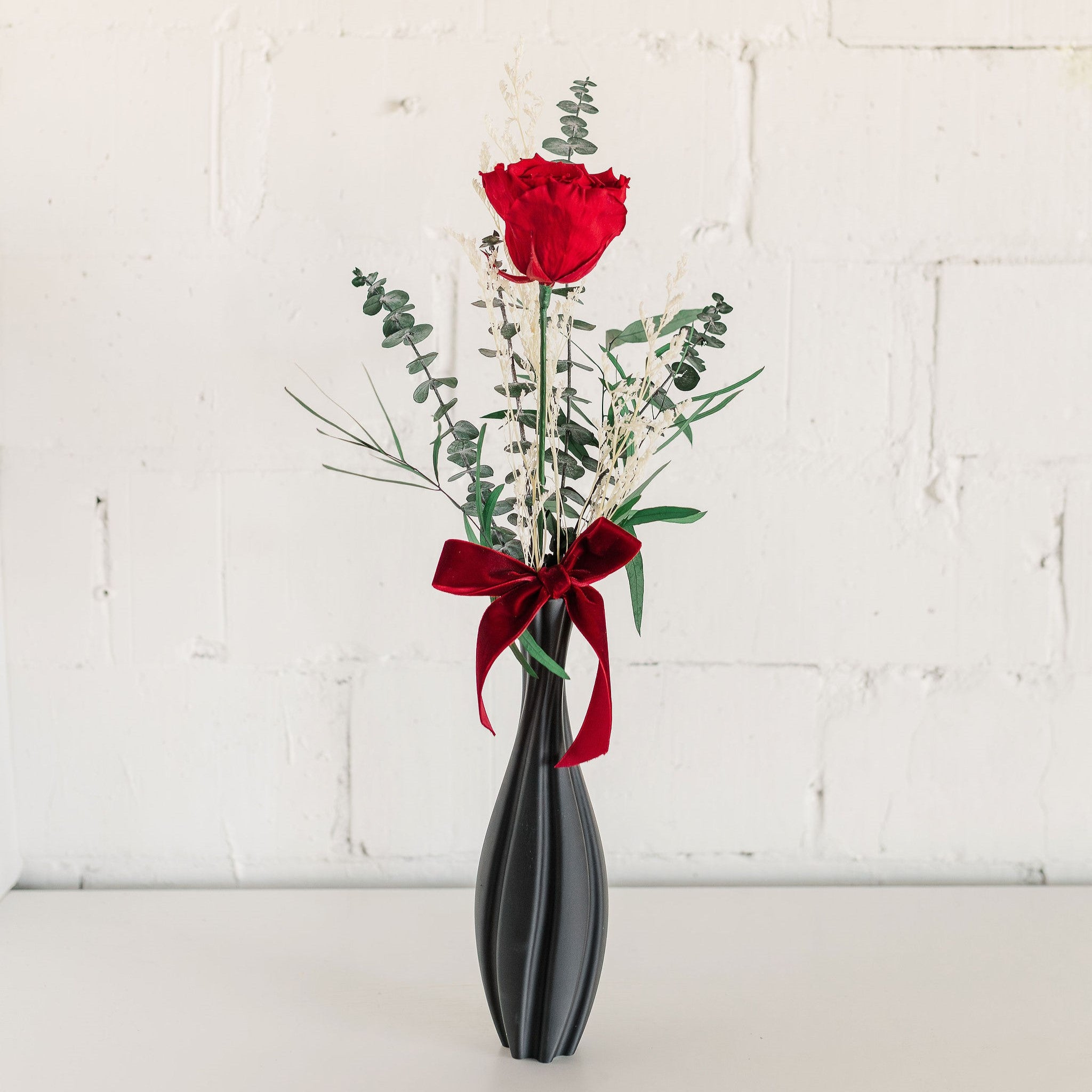 One preserved real rose arranged with preserved eucalyptus and baby's breath. This budvase has a beautiful real rose with complimentary foliage and filler. Comes in a black vase with a complimentary bow.