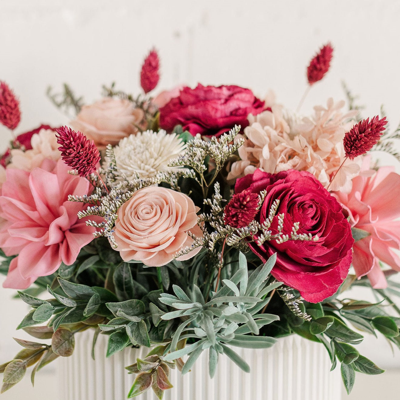 Sweetheart arrangement. This arrangement has beautiful sola wood flowers of pink, blush, cranberry, and white with complimentary foliage and fillers. Comes in a ribbed pot.