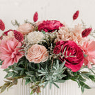 We use any combination of sola wood, preserved, dried, and real-touch (faux) flowers and foliage. This combination truly lets us unleash creativity both in color and design. Never throw away flowers again! Your flowers can last a lifetime with proper care. For care and FAQ click here: CARE & FAQ