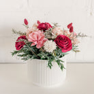 The arrangement pictured reflects our original design for this product. While we always follow the color palette, we may replace flowers and foliage depending on availability. Due to lighting when photos were taken and differences in screen appearances, products might appear lighter/darker or differ in color than actual physical products. Every arrangement is custom-made, and the placement of flowers may vary from the photos.
