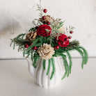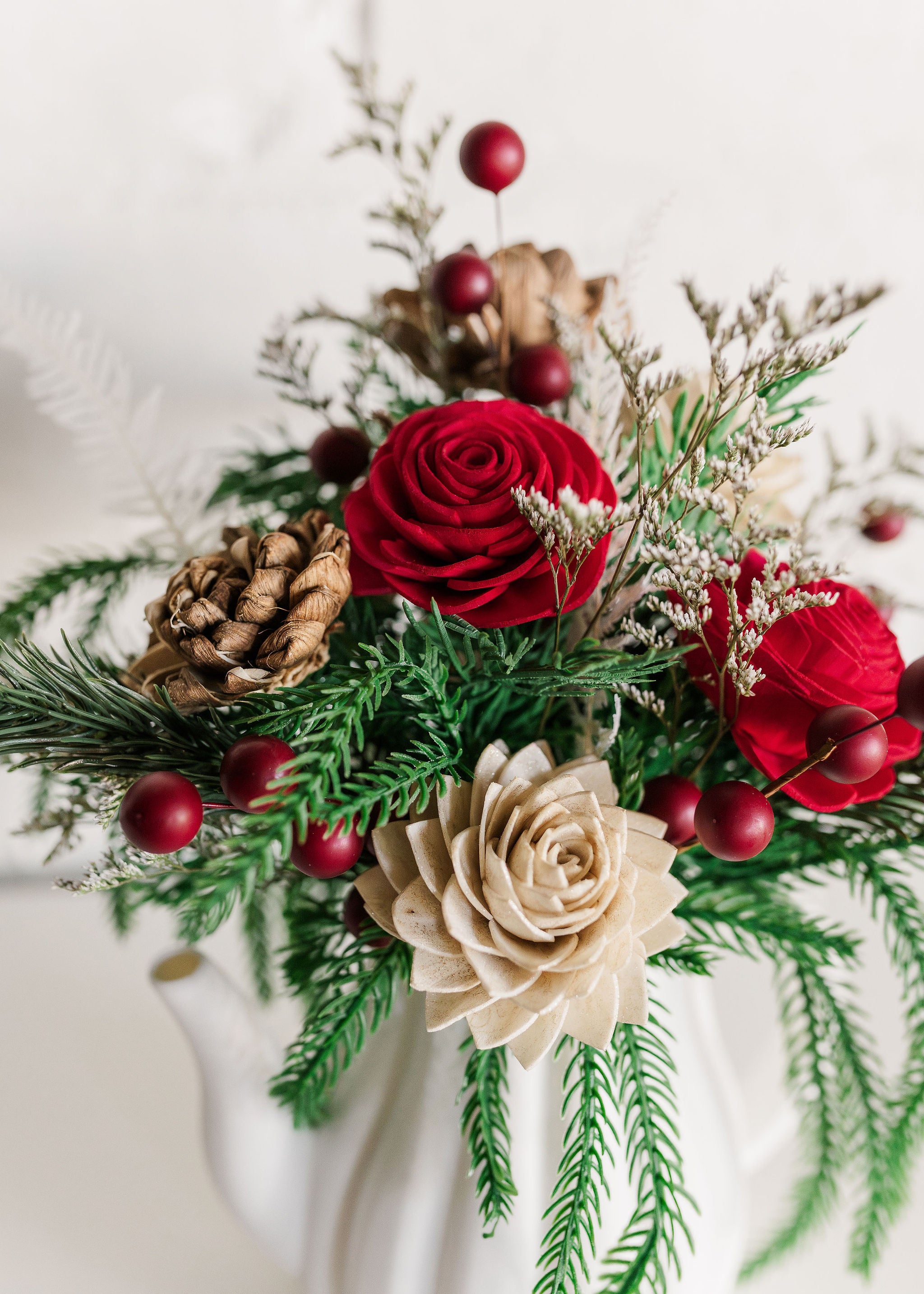 Welcome the holiday season with Winter Berry Tea, a beautiful Christmas flower arrangement. It's perfect for adding a festive touch to your home decor or gifting to loved ones. Get ready to spread some holiday cheer! Our Winter Berry Tea arrangement features sola wood and dried flowers of red, gold, bark, and white in an exclusive white teapot.